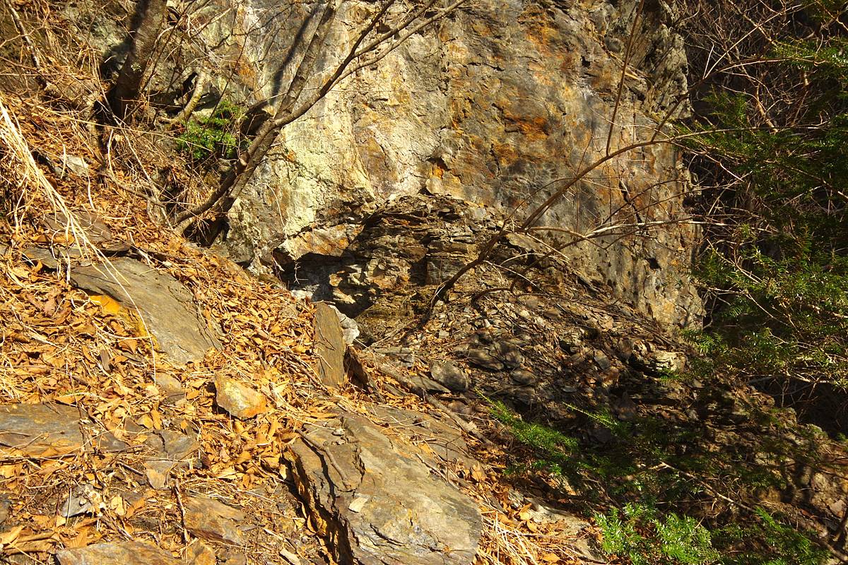 同地点から視線を右にずらすと、林道がトンネルで通過している岩場の崖壁をへつり越えようとする軌道跡を見ることができる。