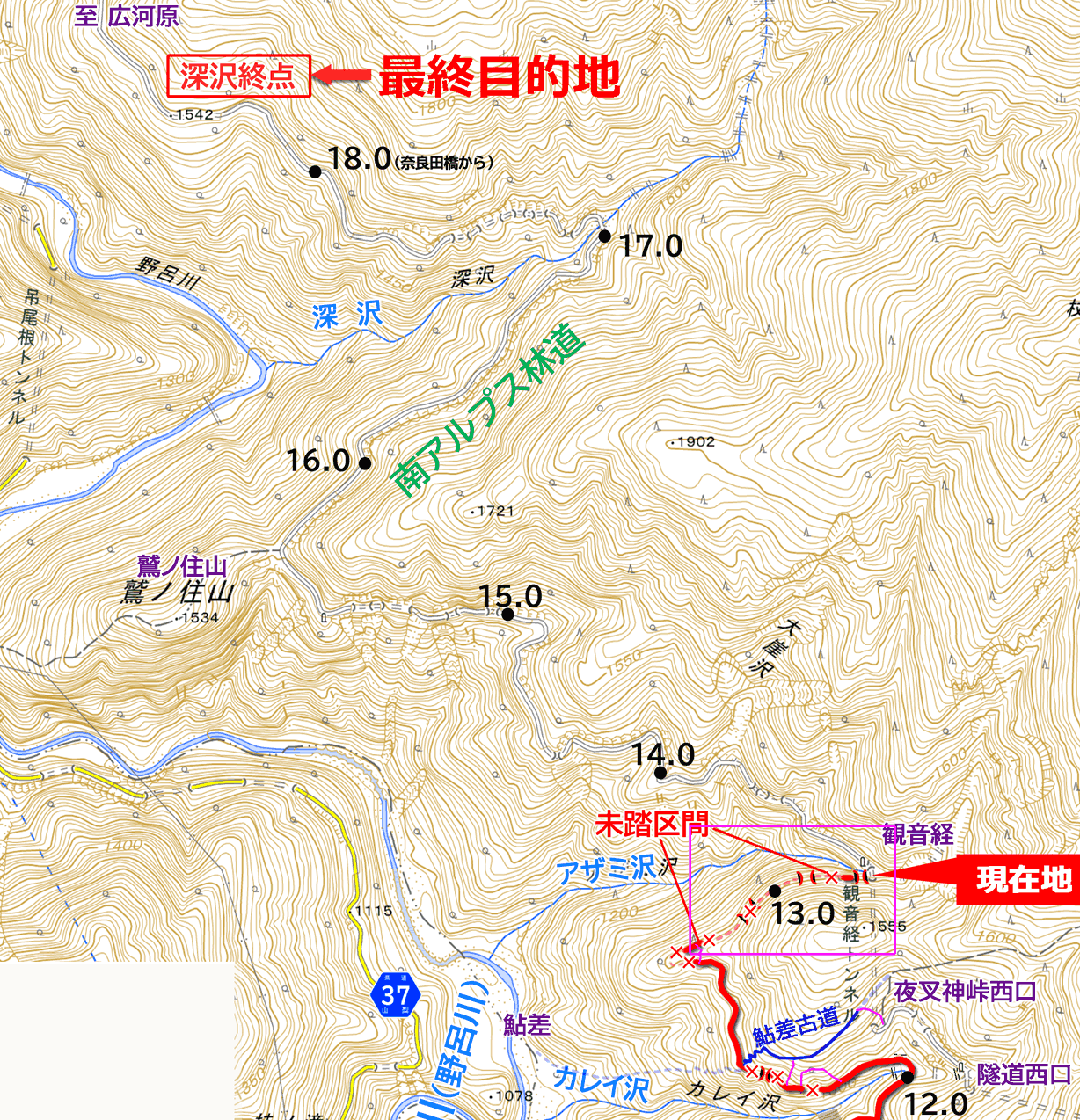 12.5kmを3時間40分で歩くのは、今の私の足の状態や探索すべき遺構のことを考えたら明らかに無理だと思うが、もう帰り道については暗くなっても良いことにしよう。最悪、深沢尾根で日が落ちるのを許容しようと思う。