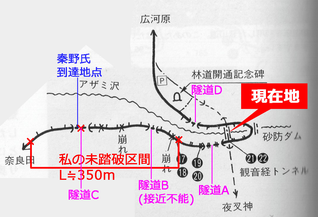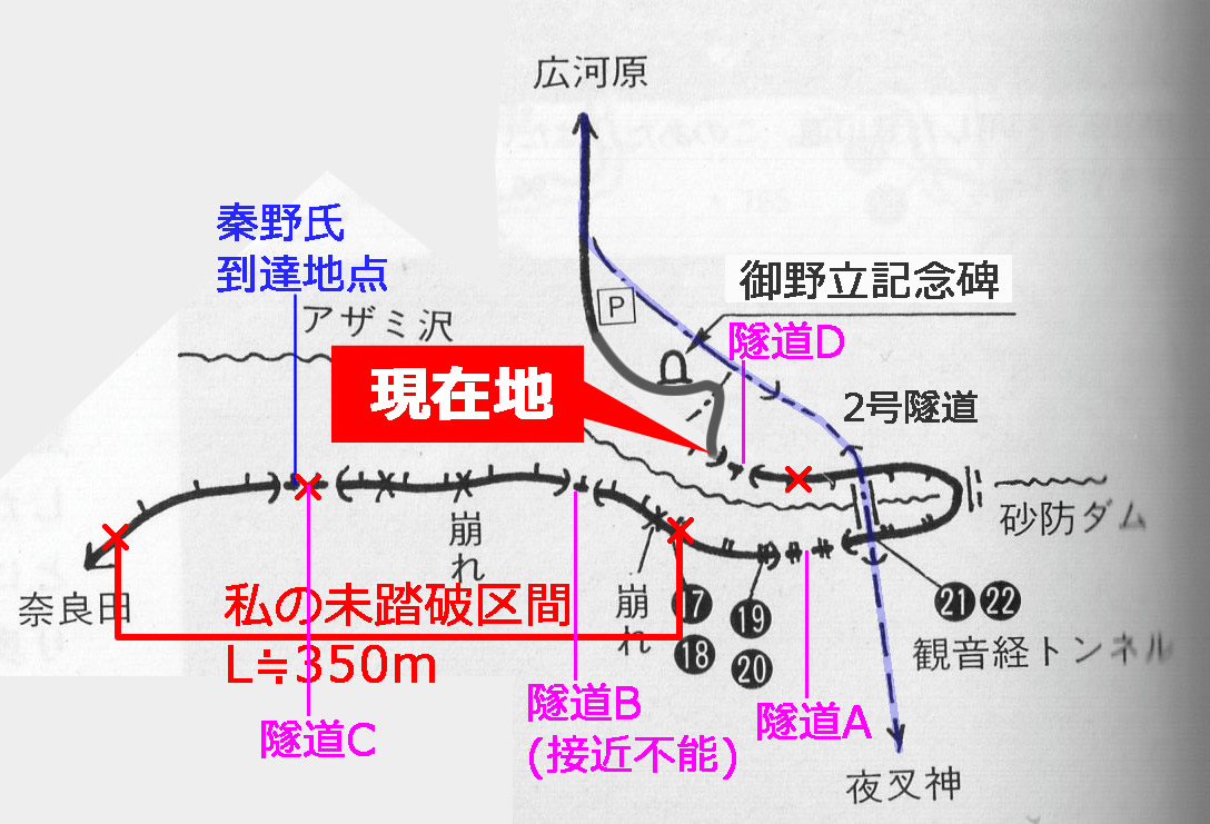 隧道A〜Cはアザミ沢の左岸にあり、現在地から近い側からAは探索済み、Bは目視できるが接近不可能、Cは私は目視もできていないが、平成17(2005)年に秦野氏が西口まで到達している。