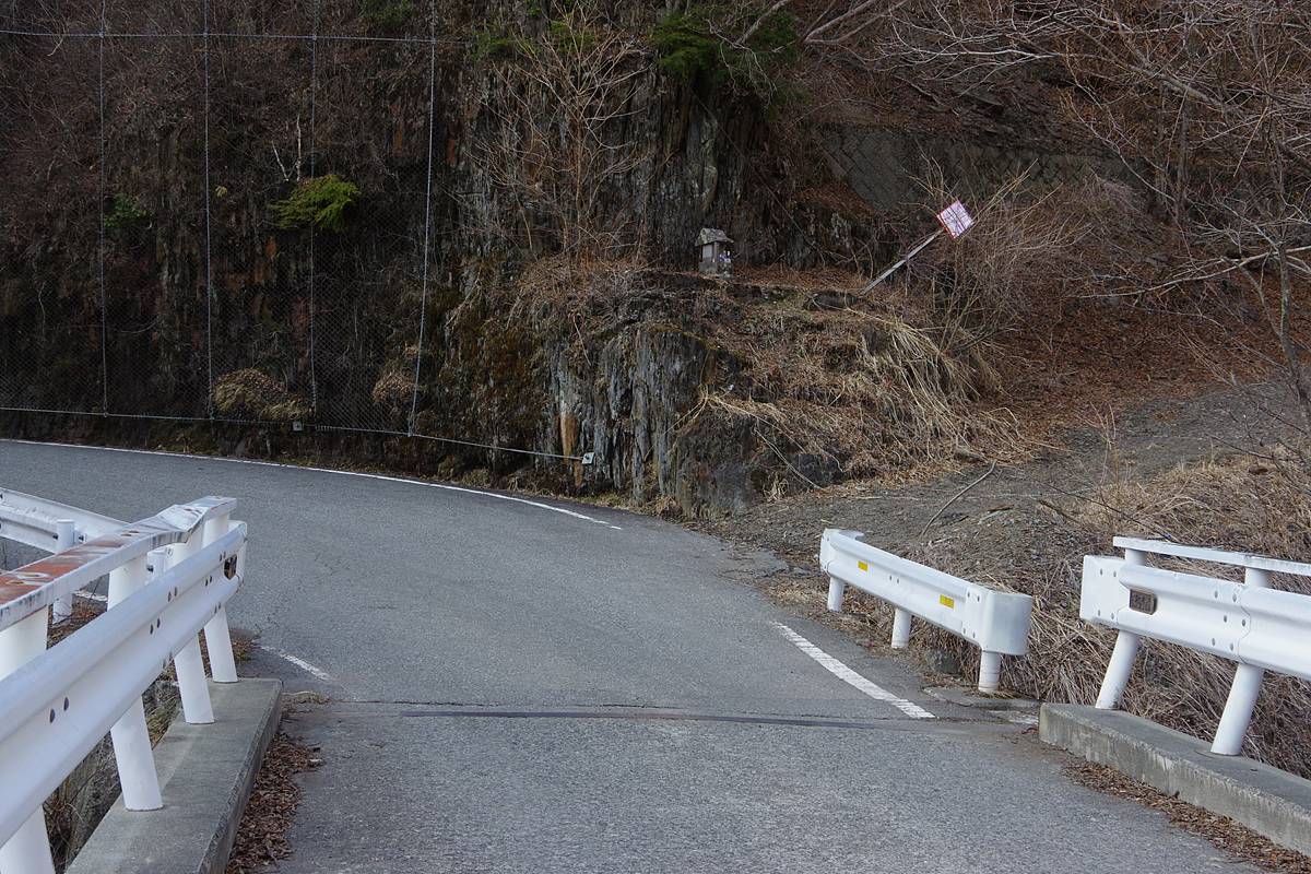 橋を渡った右岸の袂で右へ砂防ダムの工事用道路が分かれているが、その岐れの中又に苔生した小さな石祠が祀られていた。