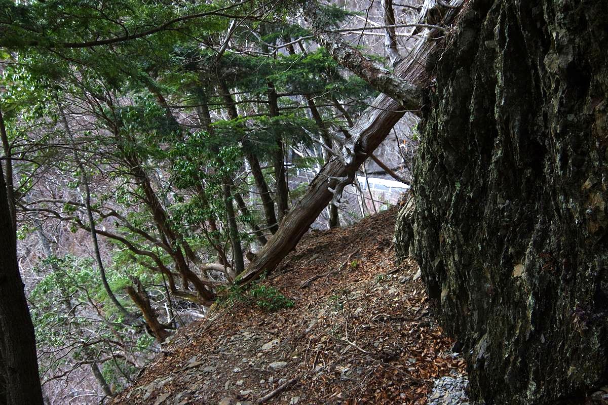 ちょうど尾根の先端を回り込んだあたりで路盤が切れ落ちていて、多少無理すれば(例えばここを越さないと先へ進めない状態なら)越せそうな状況に見えたが、足も痛いし時間もないし、何よりこの区間の全体に視界は通ったことから、満足して引き返した。それが写真の場所である。