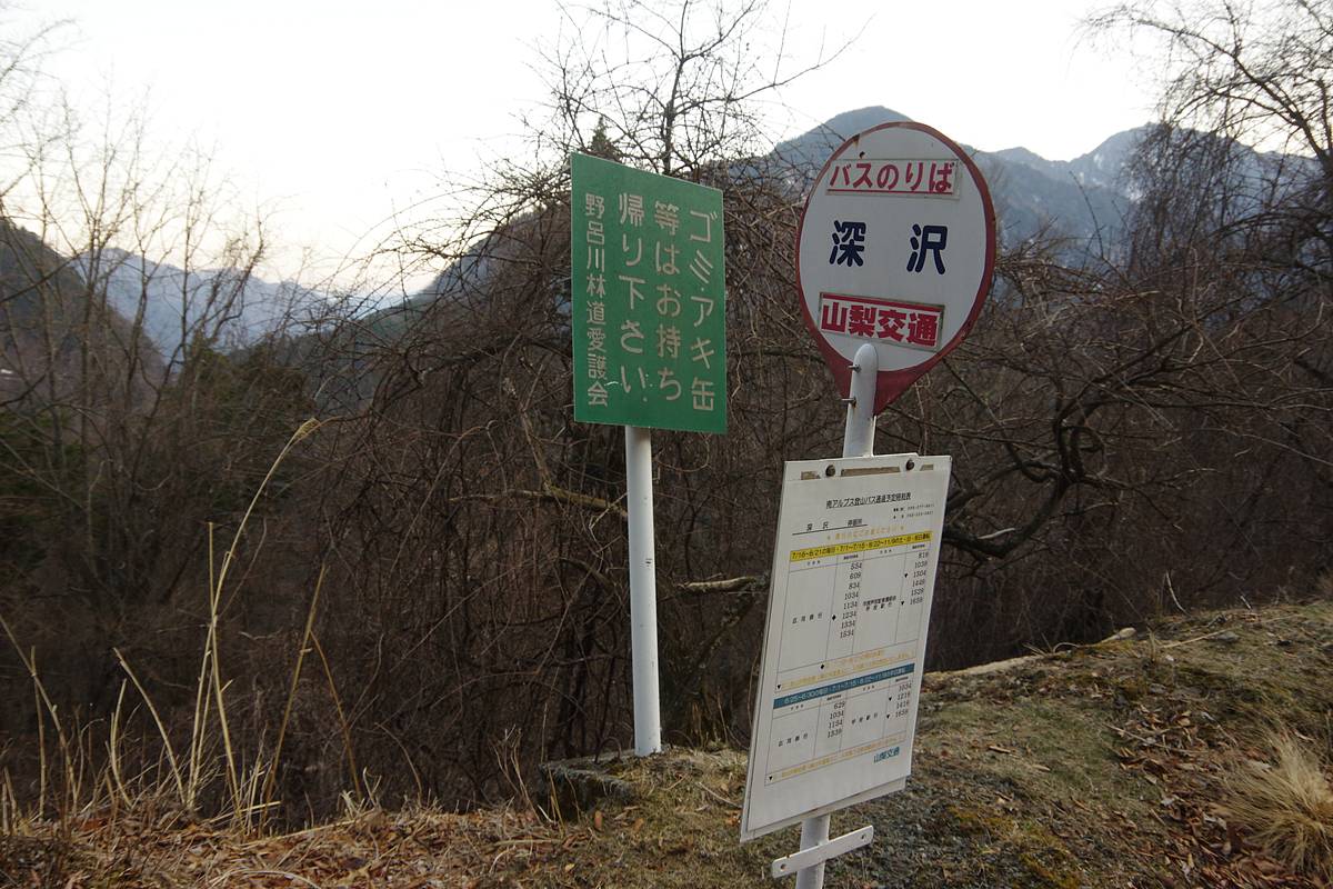 バス停の背後に立つ「野呂川林道愛護会」の看板も良い感じだ。