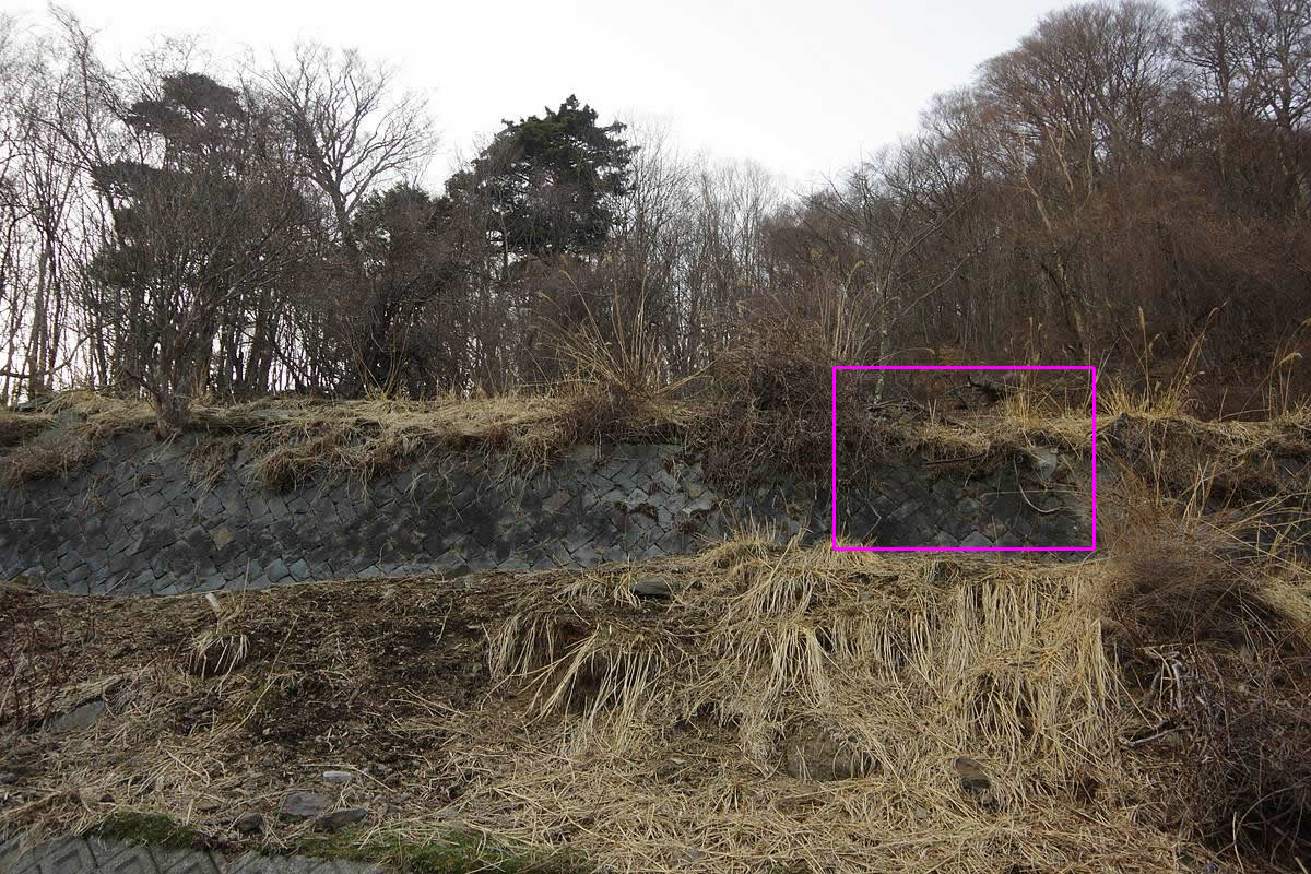 写真の矢印の位置に間知石の立派な石垣があり、その上が広場になっている。