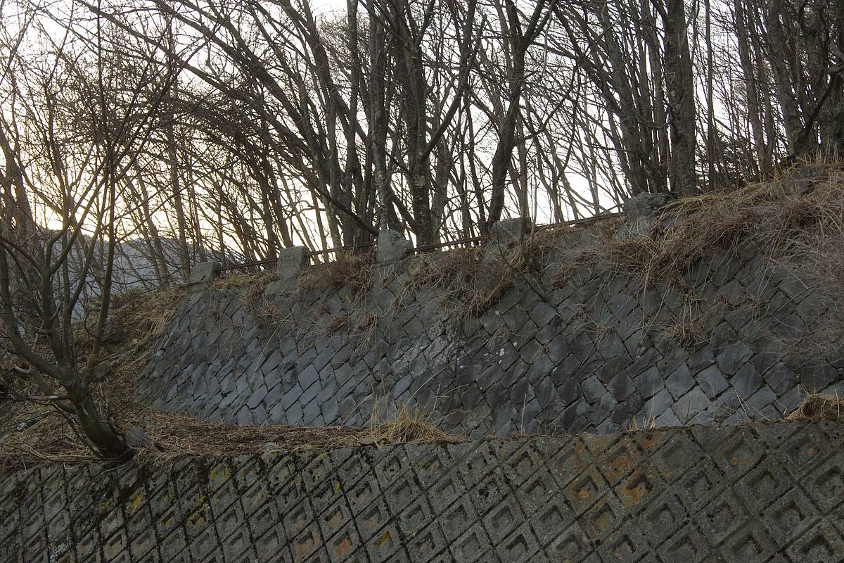 これがその石垣の写真が、よく見ると縁の部分に廃レールとコンクリート支柱を組み合わせた高欄が設置されていた。