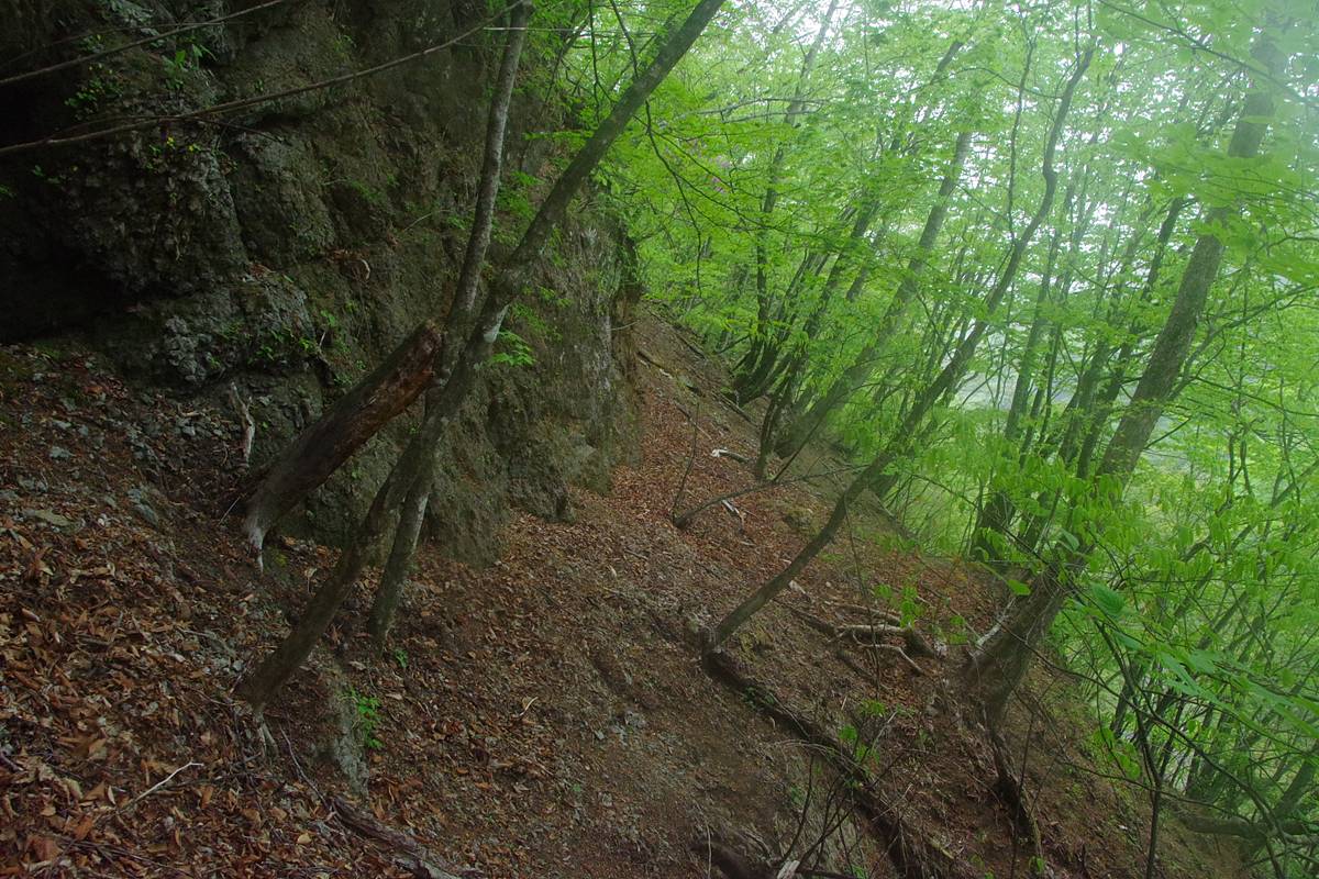 理由は、横断している斜面が急で、しかも土が締まっていて爪先が深く刺さらないことに加え、身体を保持するような掴めるものが途中に無く、上にも下にも逃げ場がない(特に下は絶壁で絶対に落ちれない)ことなど複合的。そのうえ雨が降っていて、濡れた石は滑りやすくなっている。