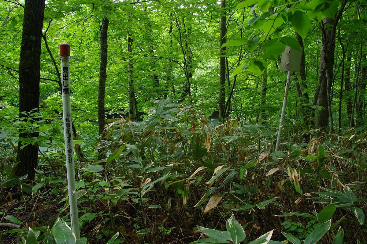 このポール自体は、文字通りの「見出し標」で、用地の境界を明確にするために設置される見慣れたアイテムだが、「国鉄事業団北海道支社」という表示は、この道路の独特の出自に関わりがありそうである。