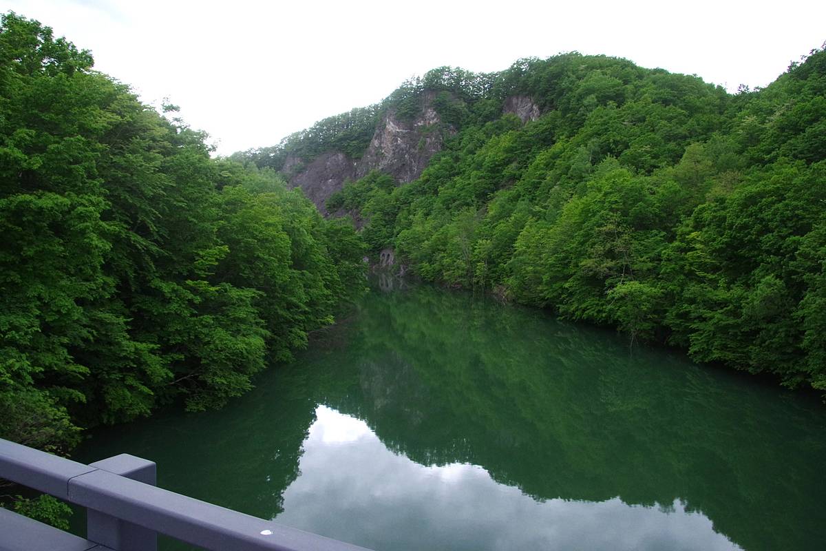 周りの緑を溶かし込んだような色の深い水が湖面のように静止しているが、800m下流に山部頭首工という取水堰があるためだ。