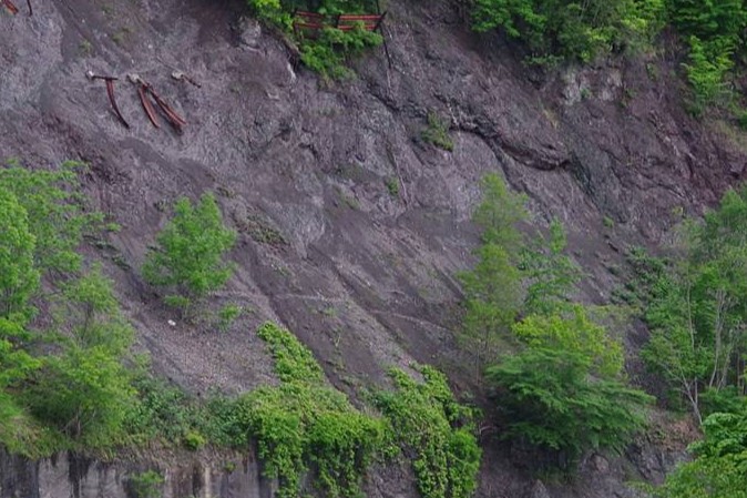 あの岩山の直下が、緑橋から遠望した旧道大崩壊の核心部だと思われる。