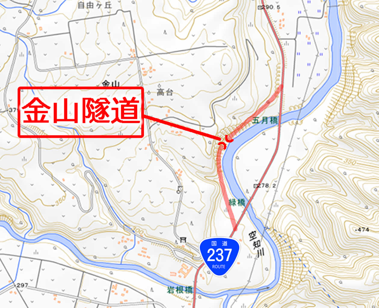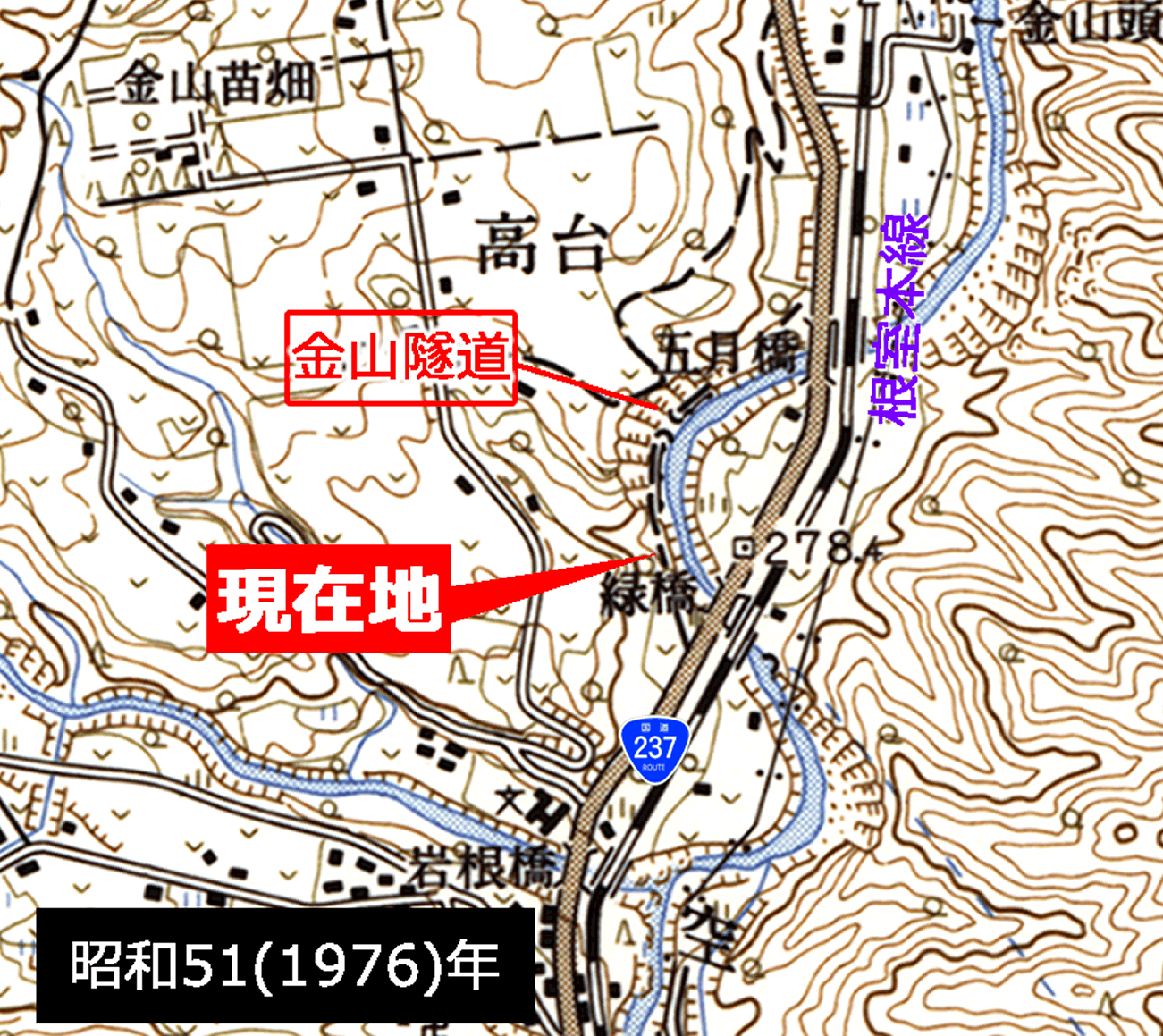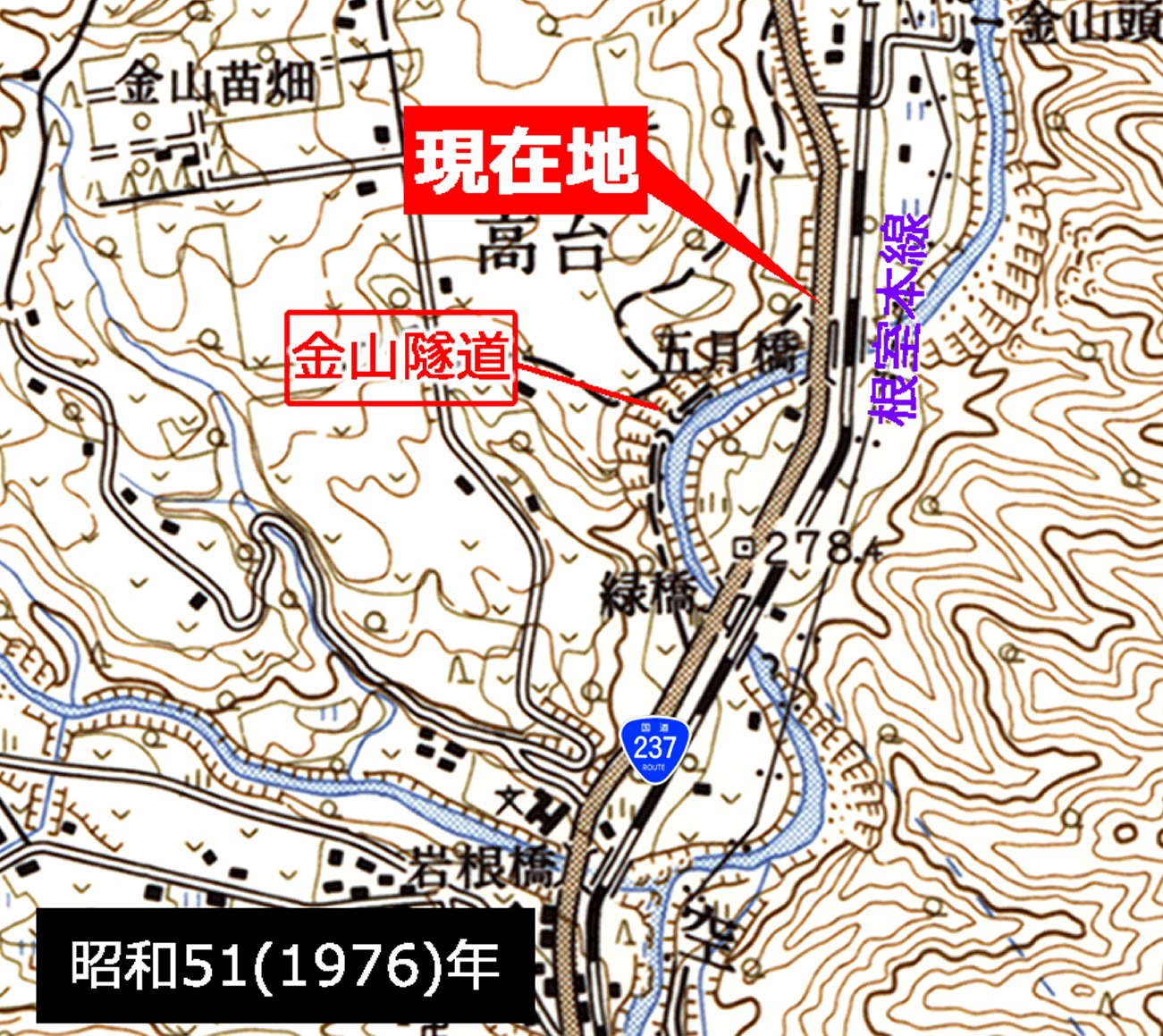 注目! Aと比べると、線路が一部付け替えられているのが分かる。そして付け替えられた旧線の跡地がそのまま国道237号の経路に組み込まれている。 鉄道時代は描かれていなかったトンネルが現われているが、実際は鉄道時代から存在していた、これが「金山隧道」である。