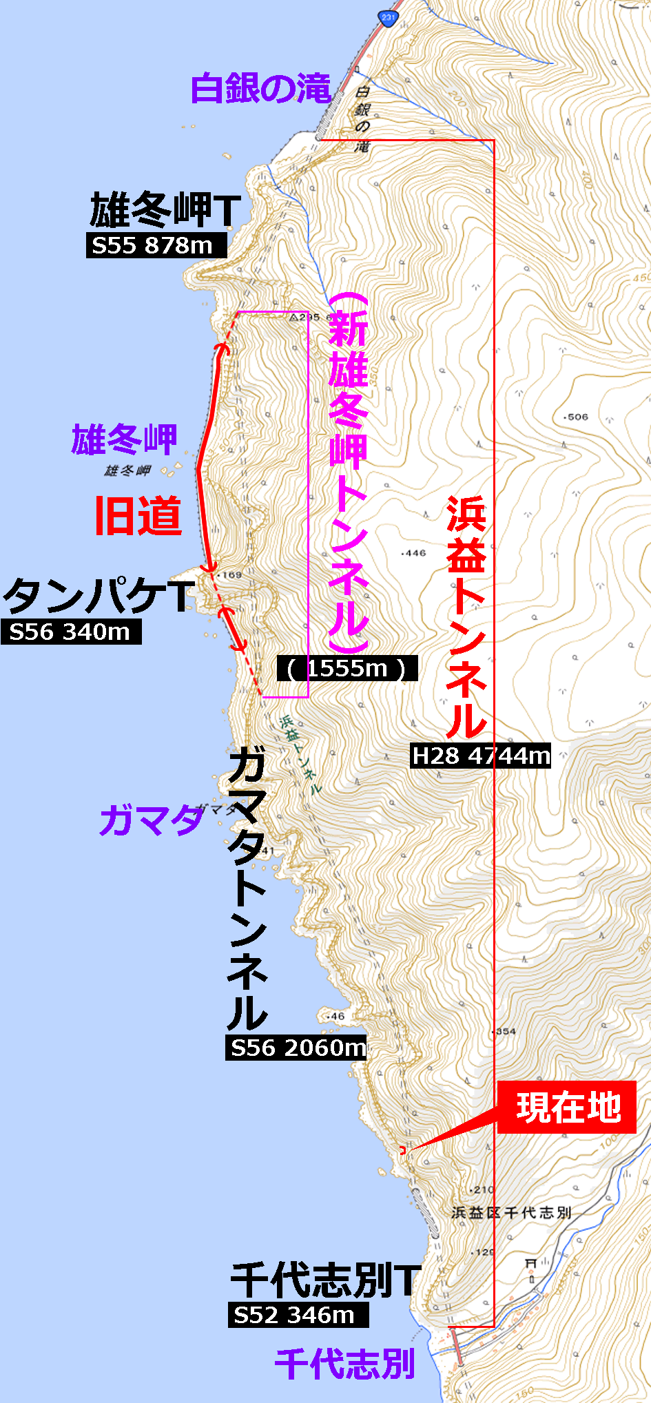 なお、従来の雄冬岬トンネルは、全長878mで、昭和55(1980)年の竣功であった。