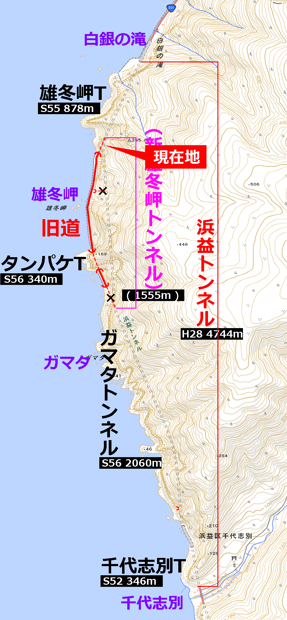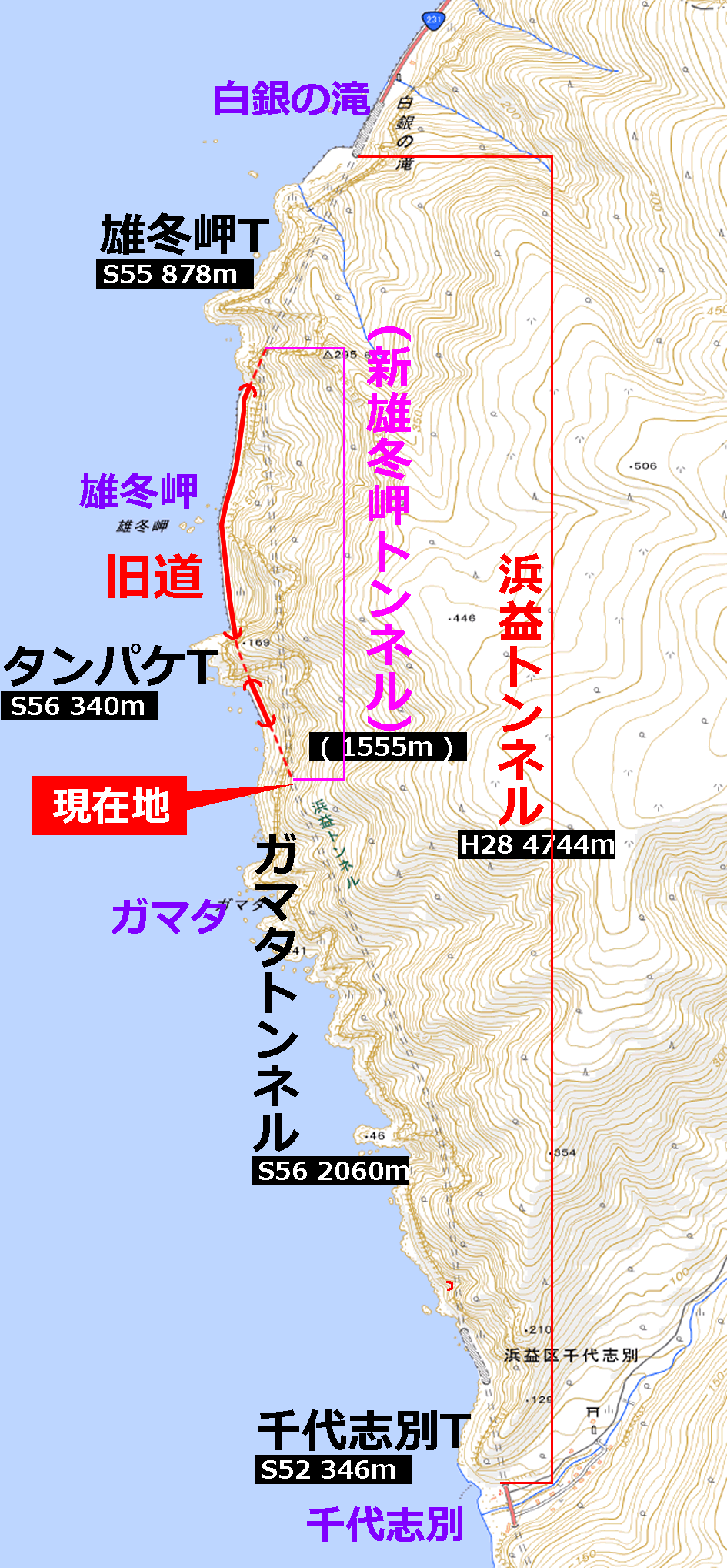 この地点は、ガマタトンネル南口から約1900mの地点(浜益トンネルとしては約2400mの地点)であり、本来はこのままあと160mほど直進したところに、ガマタトンネルの北口があった。