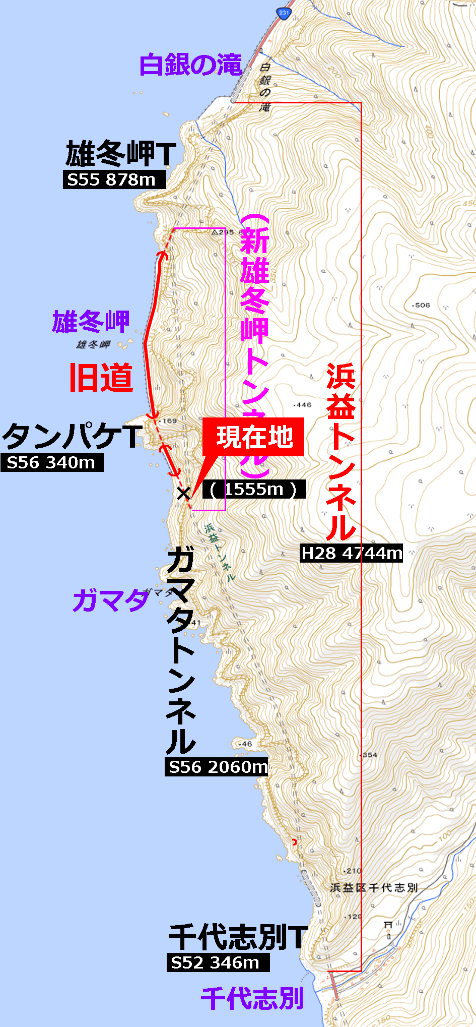 北口から約750mの地点で、新雄冬岬トンネルと接続しており、接続部以南の100m強が廃止されている。