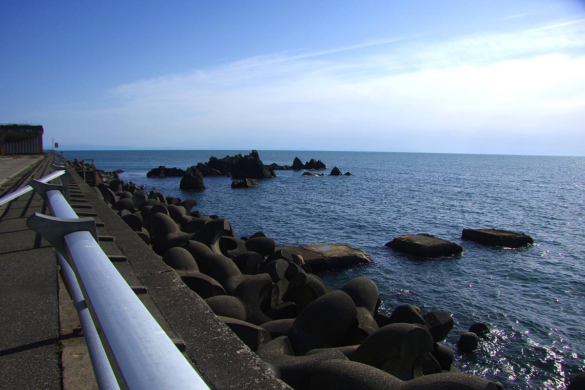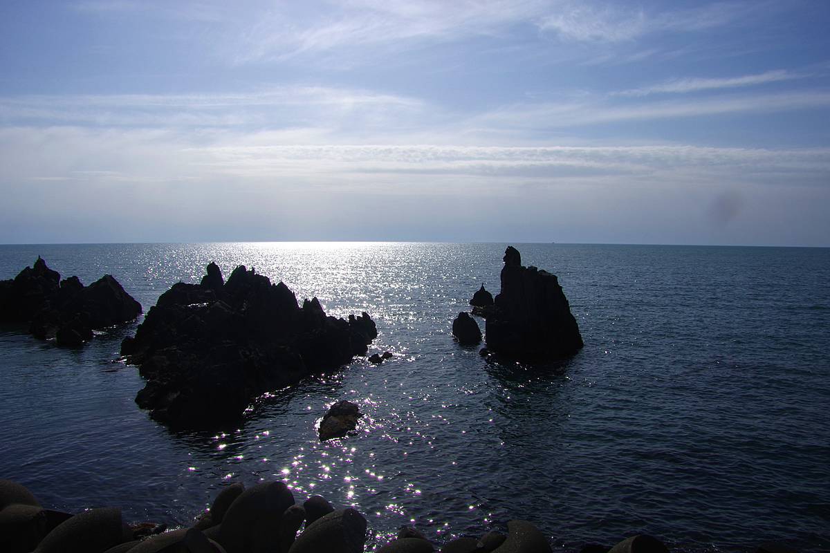 タンパケ覆道北口の緩やかなカーブから、ガードレール越しの海を眺めると、いくつかの岩礁が浮かんでいる。