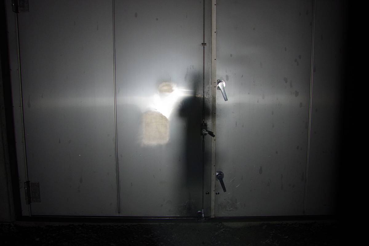 扉の表面に、私の探索時には見られなかった黄黒配色の表示物が追加されており、画質的に文字が読みにくいが、目を凝らすと、「●●カメラ作動中●●カメラ作動中」と書いてあることが分かる。