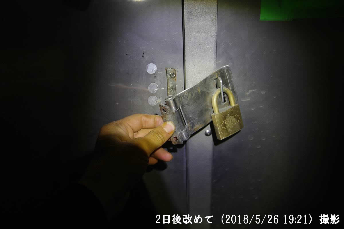 だが実際はこの時点で既に南京錠でロックされている留め金の部分が破断しており、施錠はされているのに扉の開け閉めを妨げないという状況になっていたのだ。