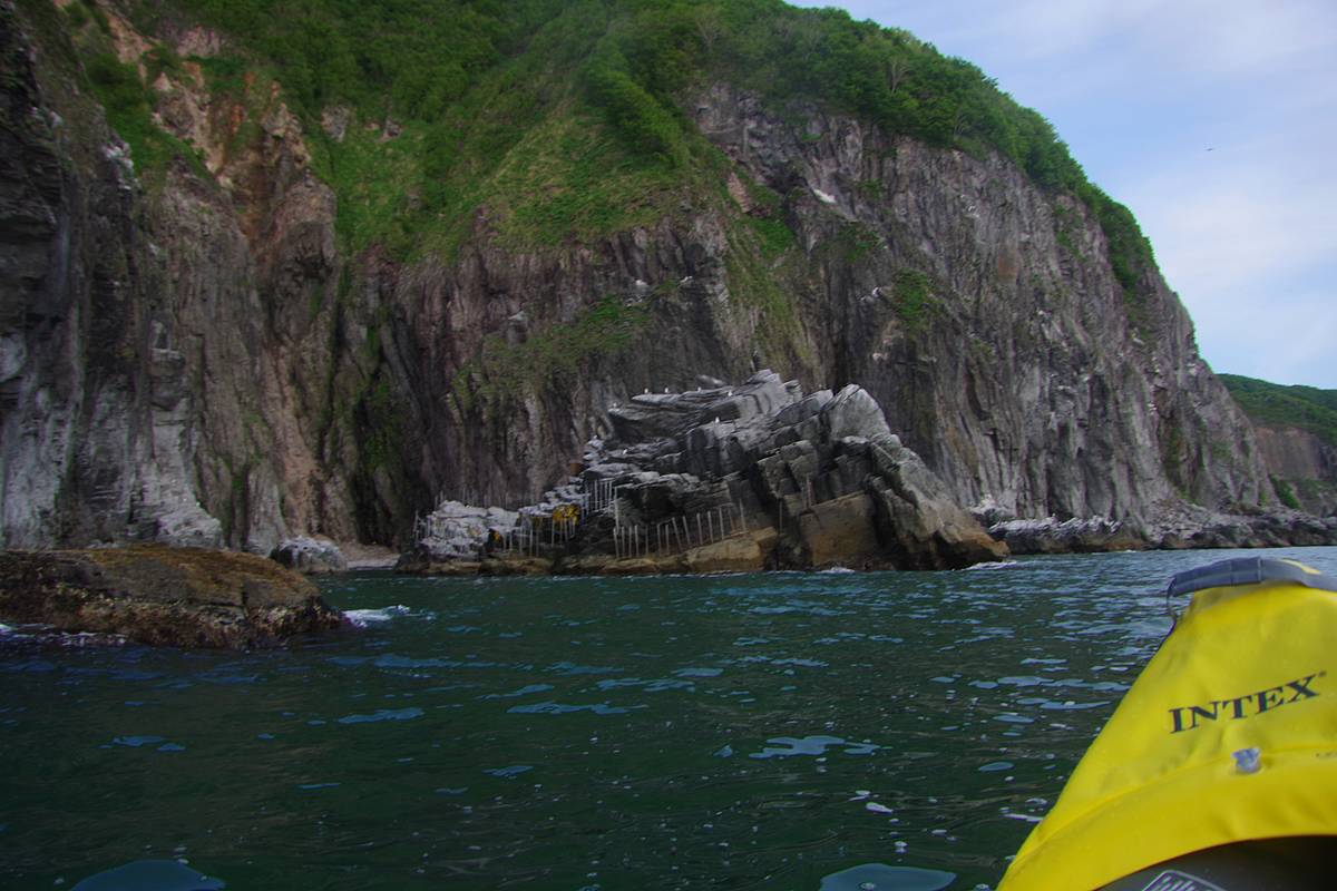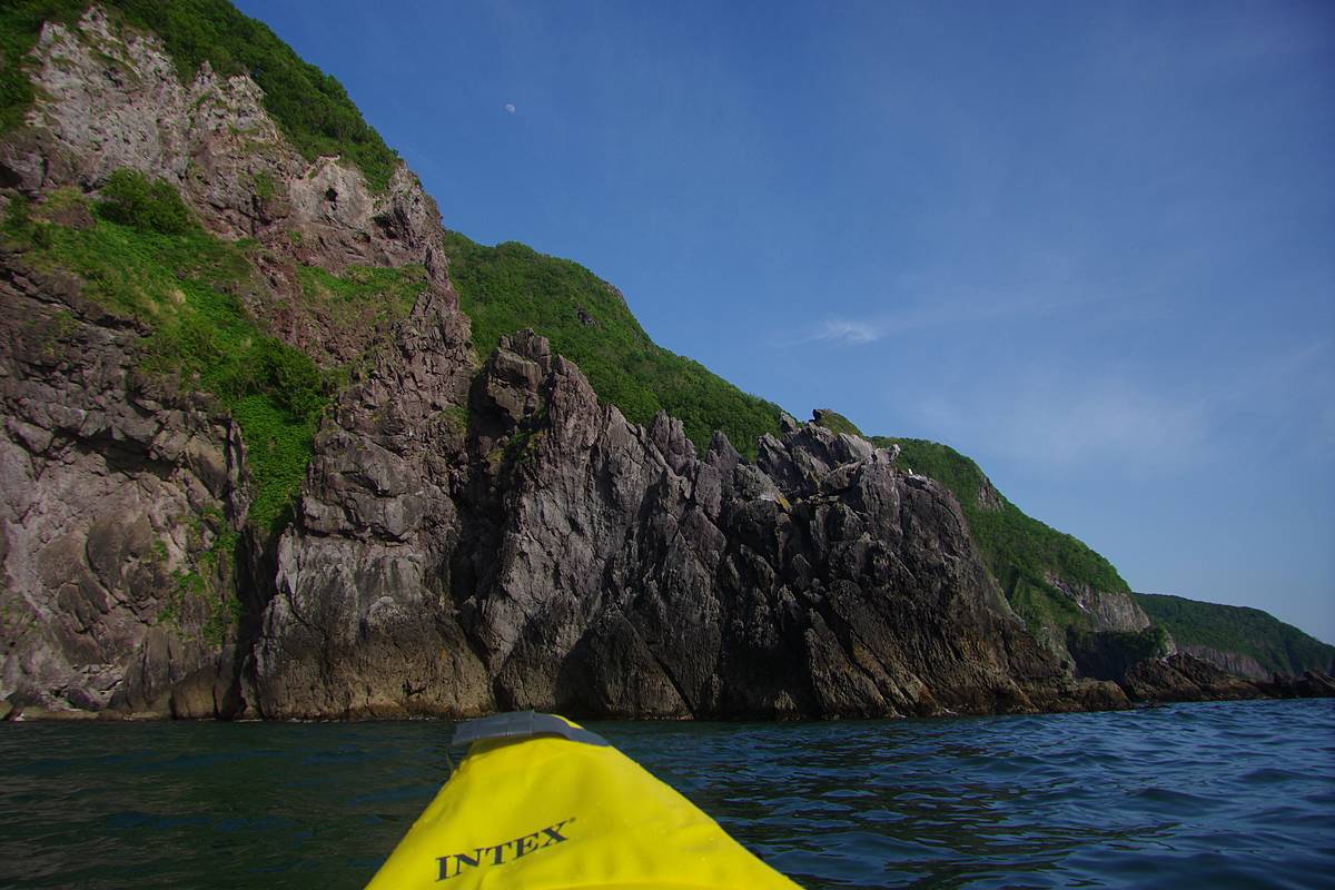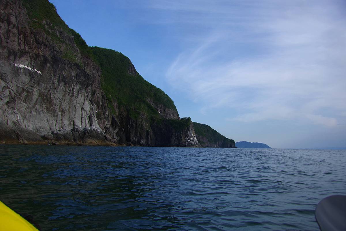 文字通り、取付く島のない海岸線を、品定めでもするように頭上を旋回する海鳥たちに賑やかされながら、漕ぎ、進み、漕ぎ、進み、中間地点の岬に達する。