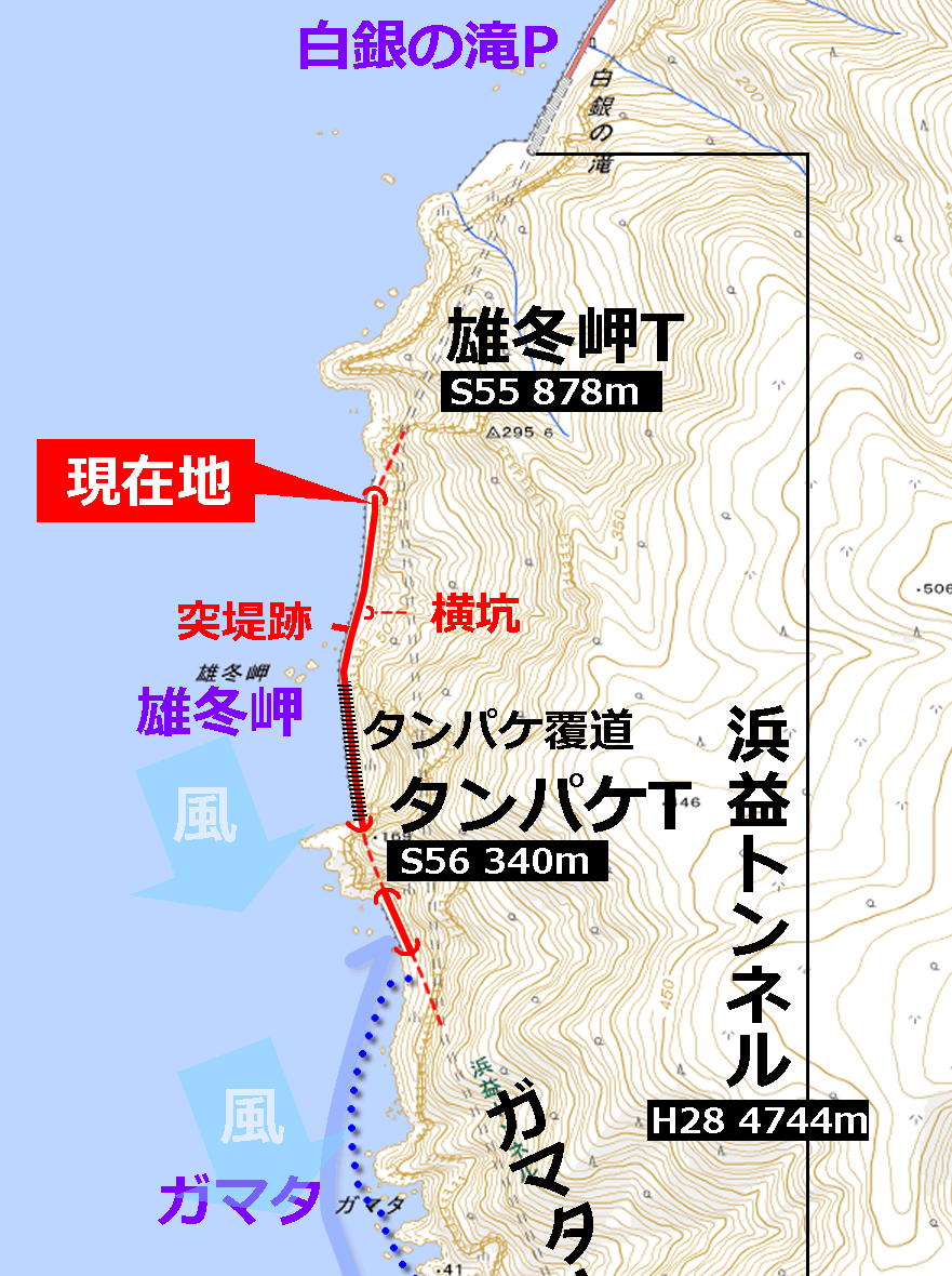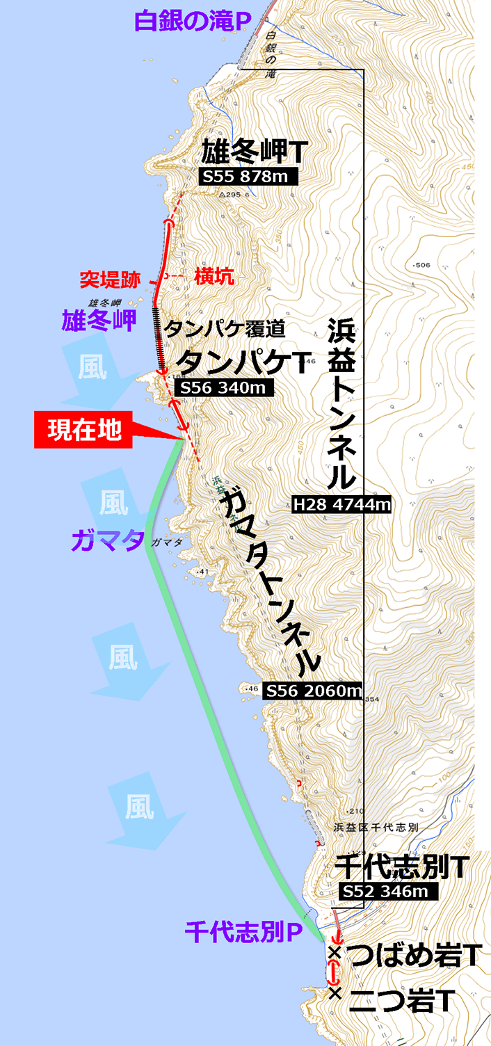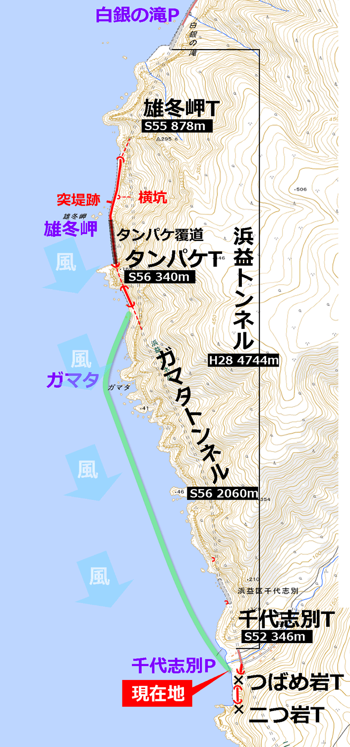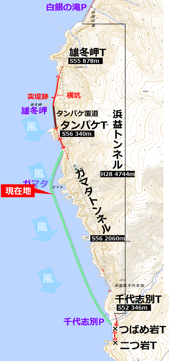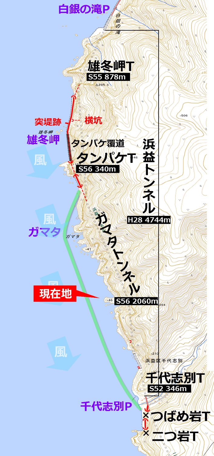 地図を見てもそのように描かれているが、浜益トンネルの側面はどこも海岸線からそう離れていないのである。