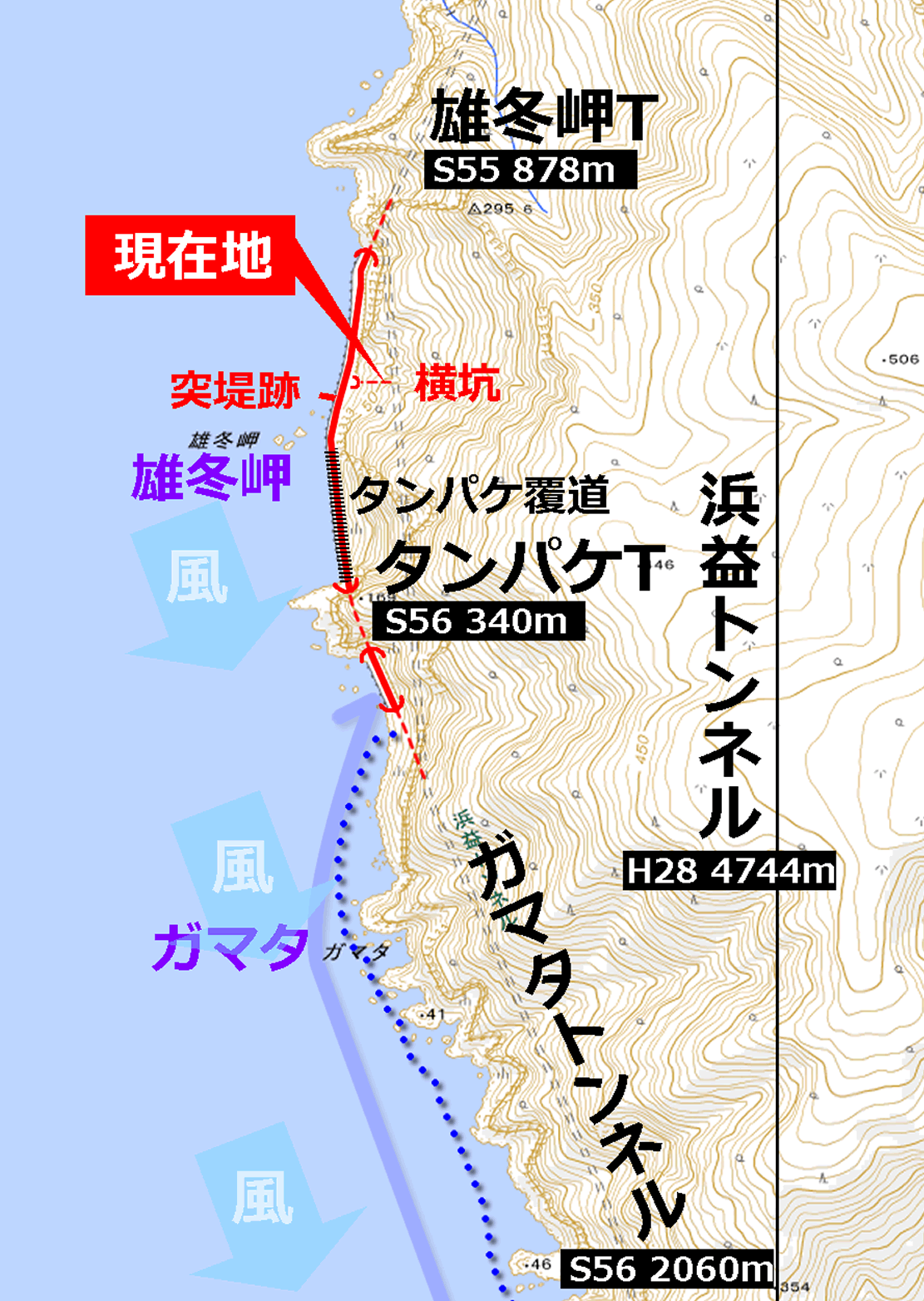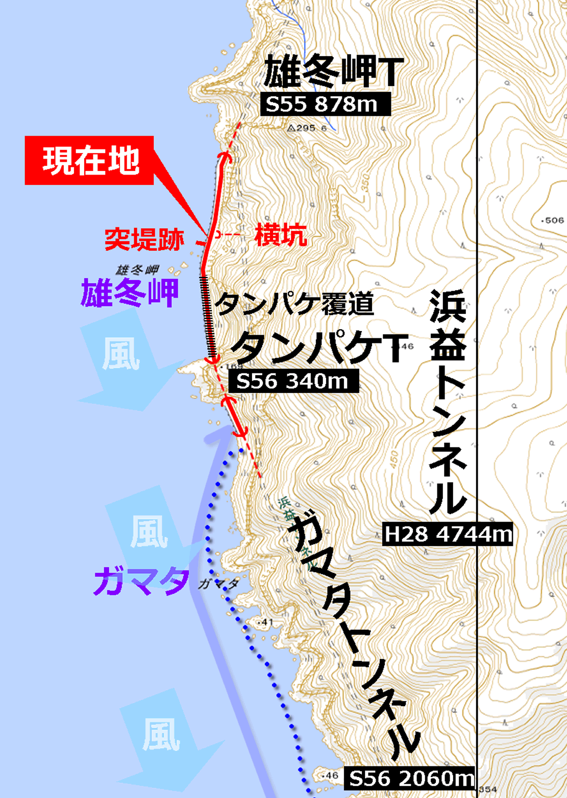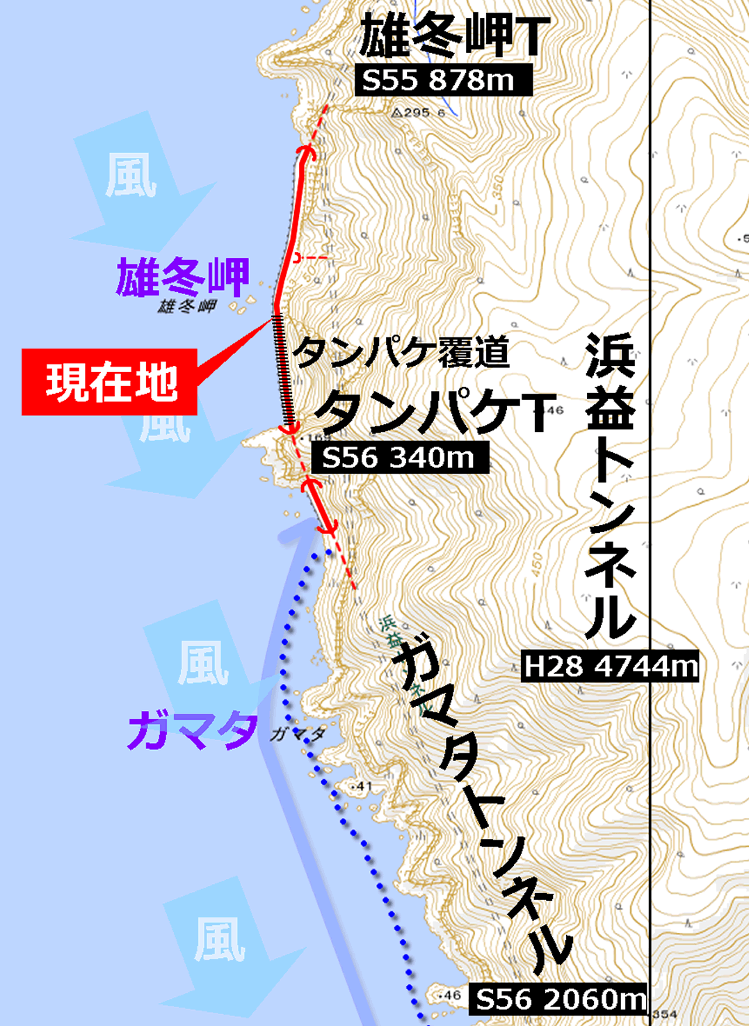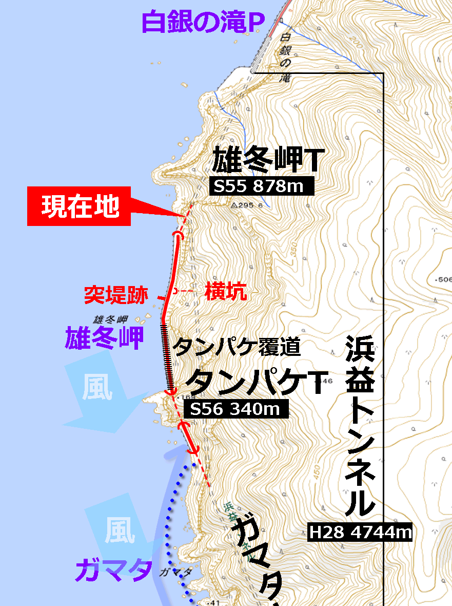 地図を見てもそのように描かれているが、浜益トンネルの側面はどこも海岸線からそう離れていないのである。