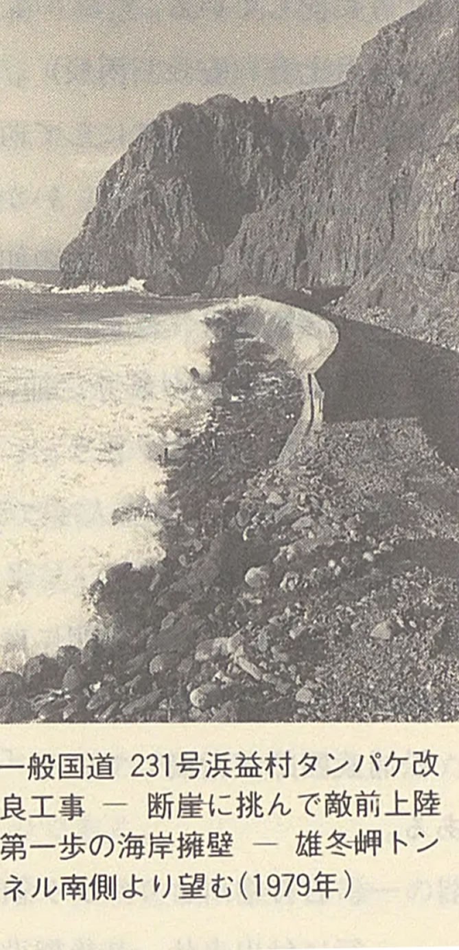 一般国道231号浜益村タンパケ改良工事 ― 断崖に挑んで敵前上陸第一歩の海岸擁壁 ― 雄冬岬トンネル南側より望む(1979年)