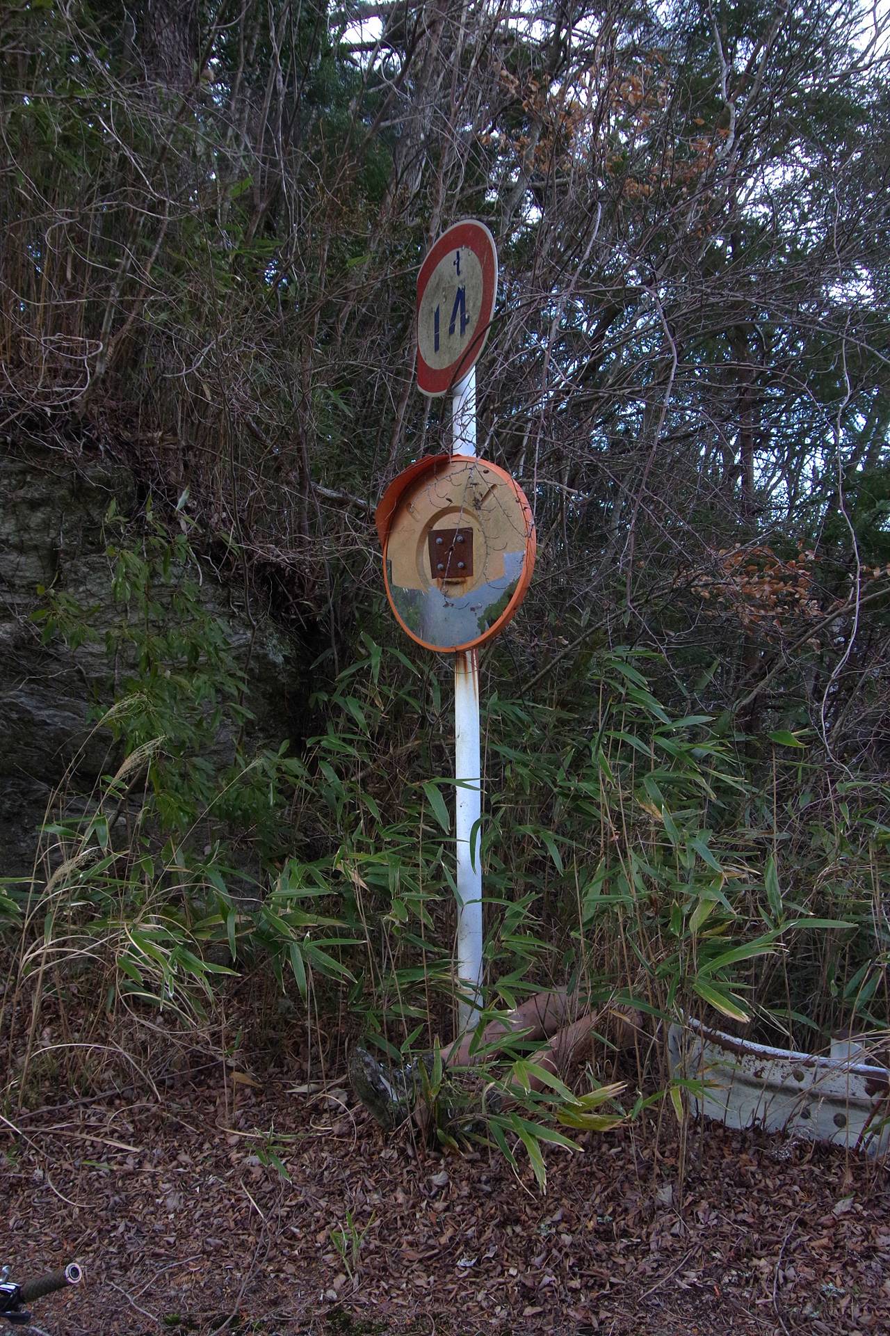14tの重量制限標識と、壊れたカーブミラー。