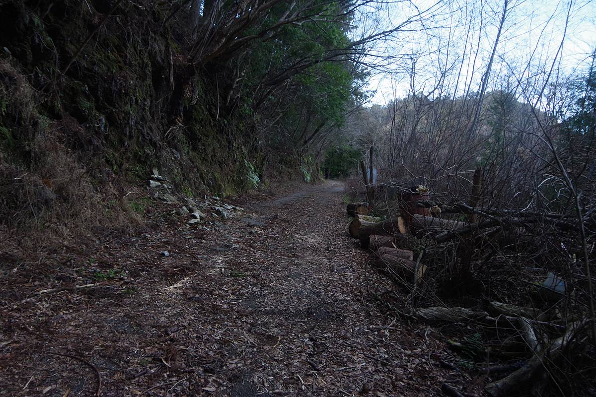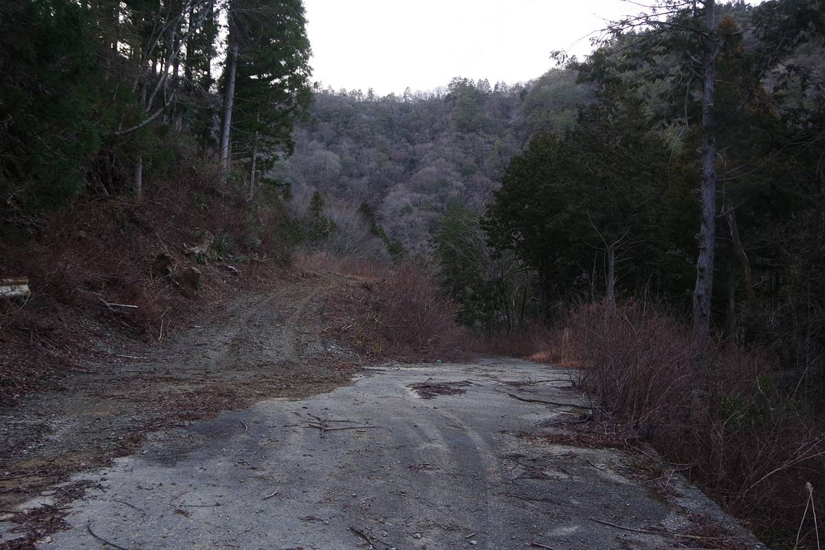 旧道沿いに即席の土場が造られており、山手へ入っていく地図にない作業道が分れている。