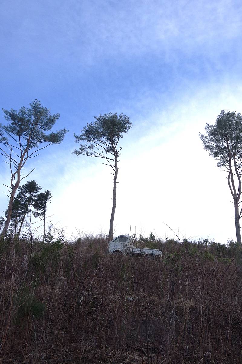 前方に意識を集中していたところ、いまいる道のすぐ上の急斜面に軽トラを見つけて驚いた。