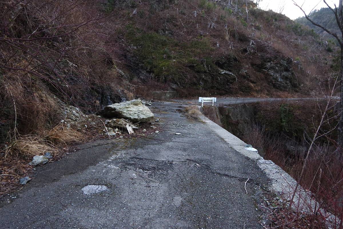 大きな岩塊が路上に転げ落ちていて、道幅の山側半分を塞いでいた。残り幅は2m未満である。
