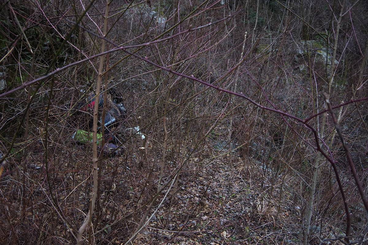 盗難車かとも思ったが、わざわざこの場所へ隠すとは考えにくい気が。谷に棄てることも出来ただろうし。