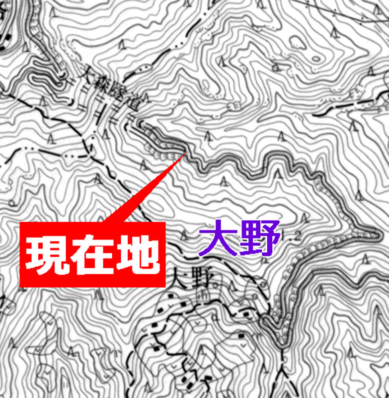 この尾根の前後の道は、地形図だと物凄い急斜面に、長い崖記号の法面を従えるように描かれている。