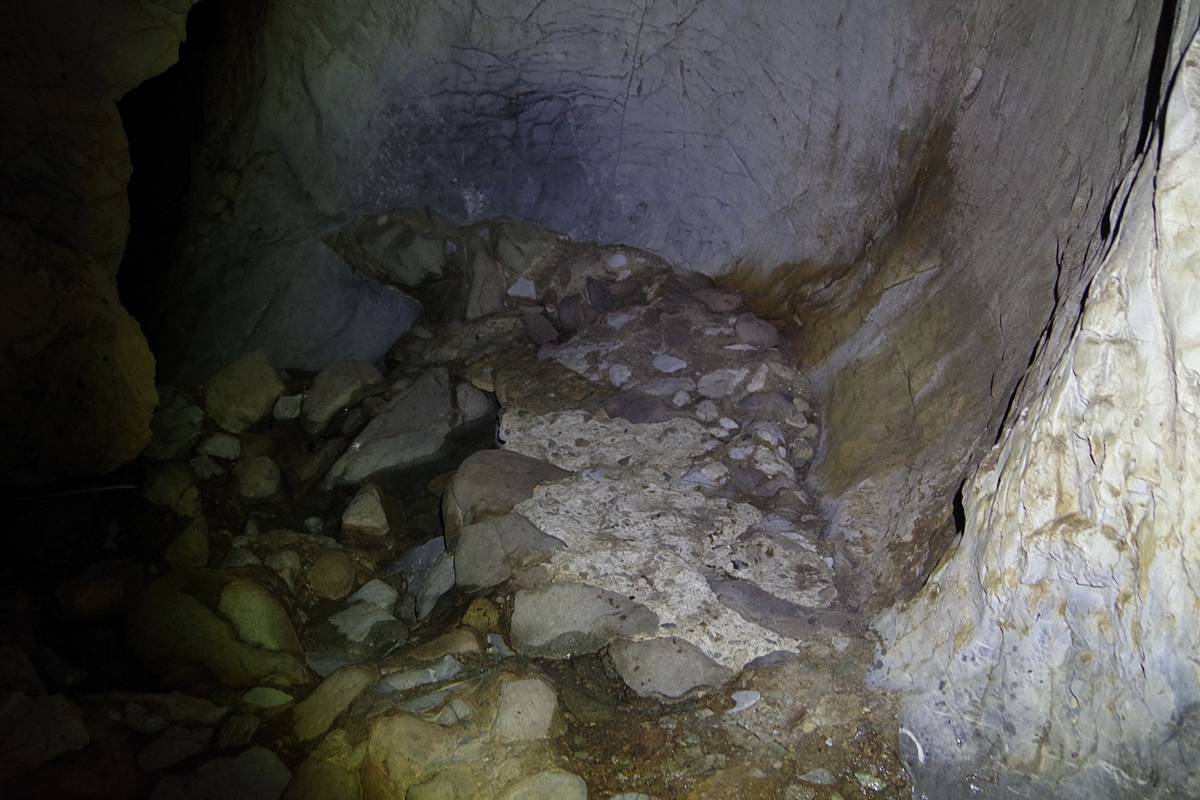 洞床の一画に作設された、石とコンクリートを使った幅1mほどの通路の残骸である。