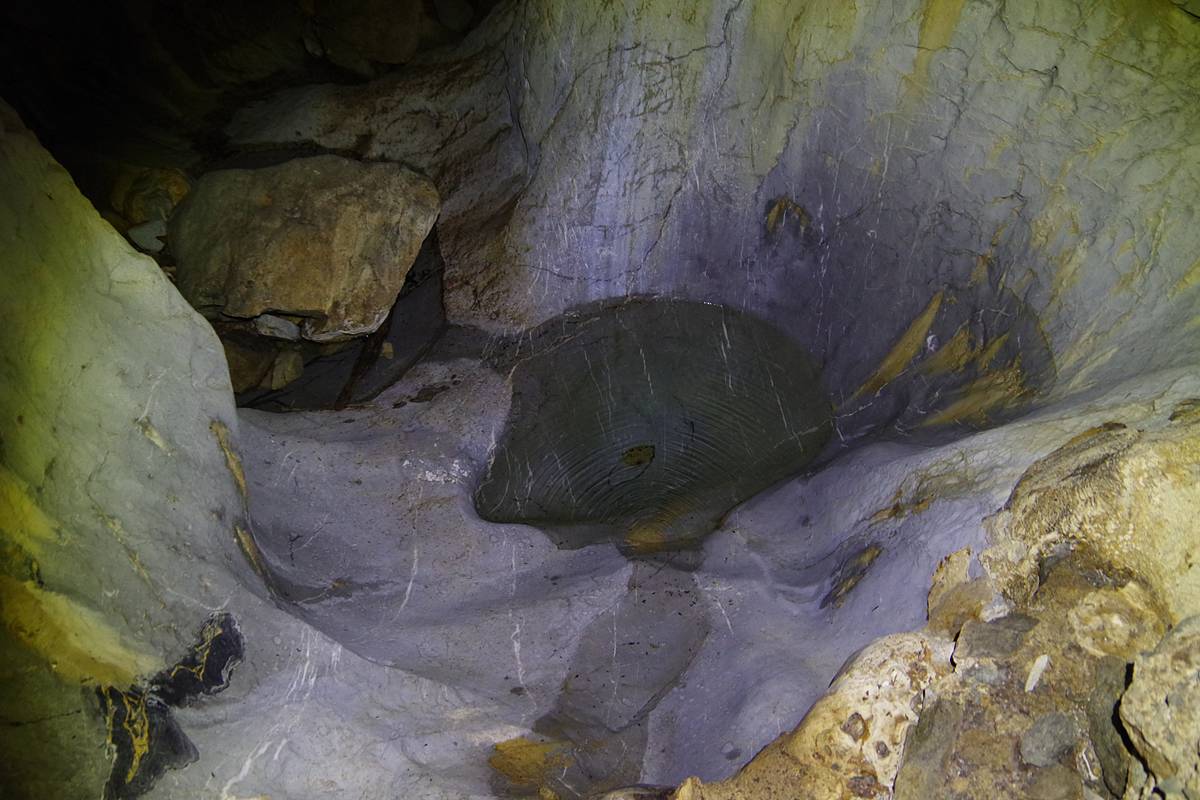 なぜか洞内のどこよりも黄土色なのが謎なのだが、幸いにして、この黄土色の物体、見た目の印象とは異なり、とても堅く、しかもザラザラとした手触りをしている。