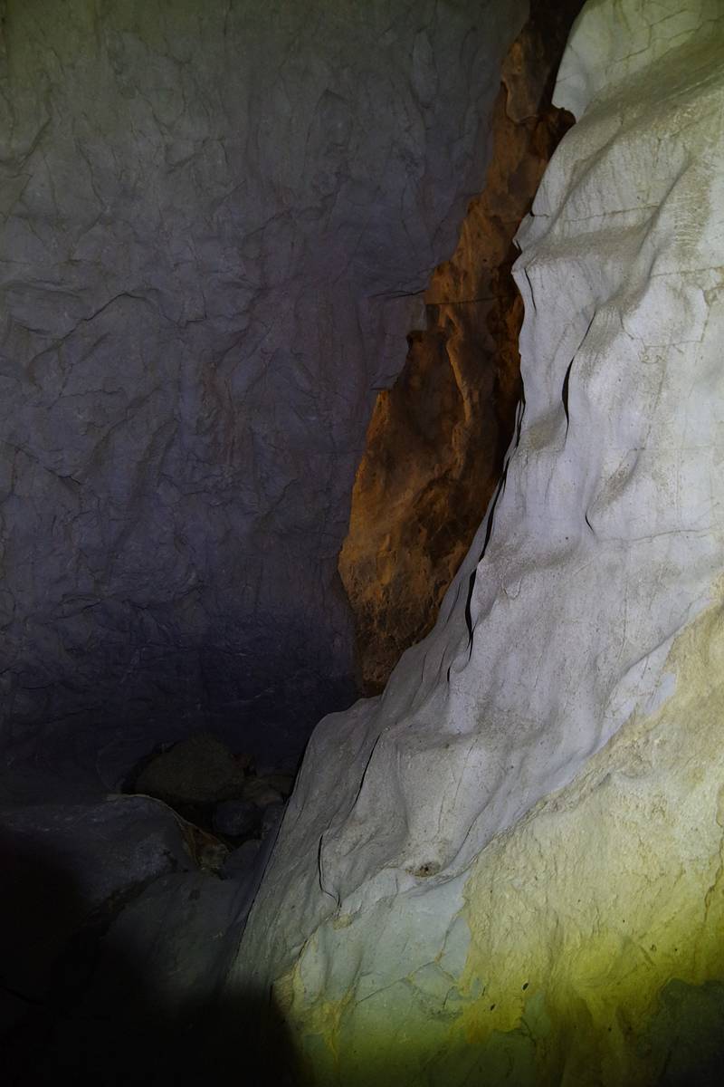 左右の切り立った壁は、流れるような模様の二次生成物に覆われた石灰岩で、洞床には相変わらず外から流れ込んできたらしき茶色い瓦礫が堆積している。