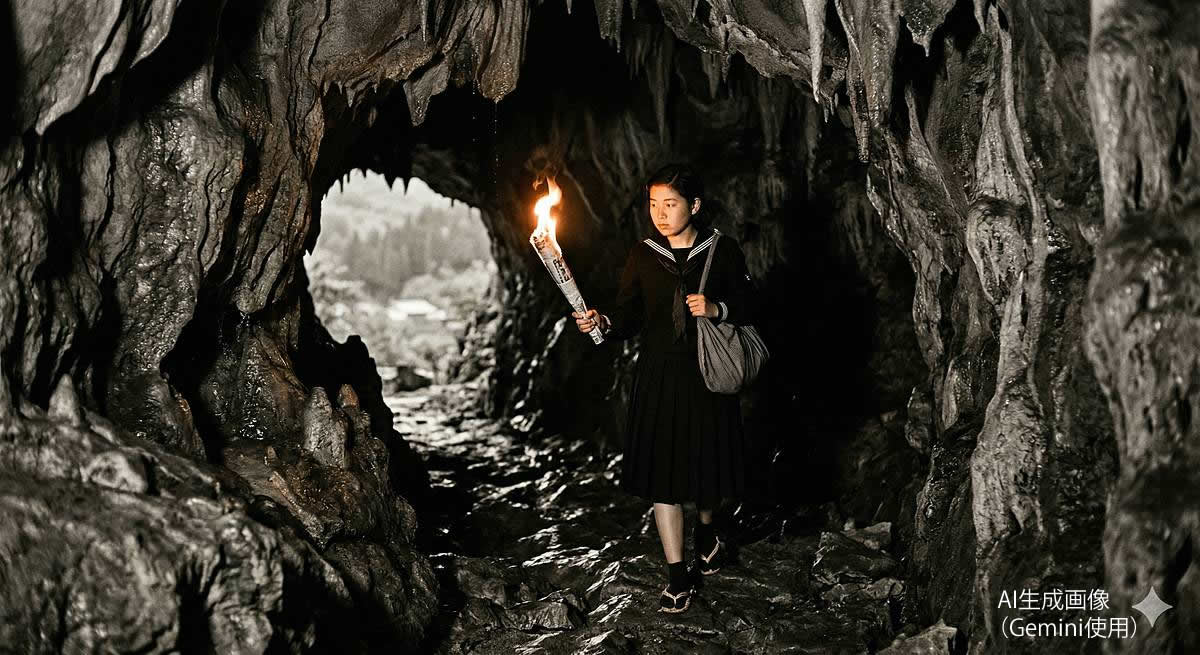 その際には、イメージ画像のように、丸めた新聞紙に火を付けたものを灯りとして、それが燃え尽きるまでに脱兎の如く洞内を駆け下ったという。