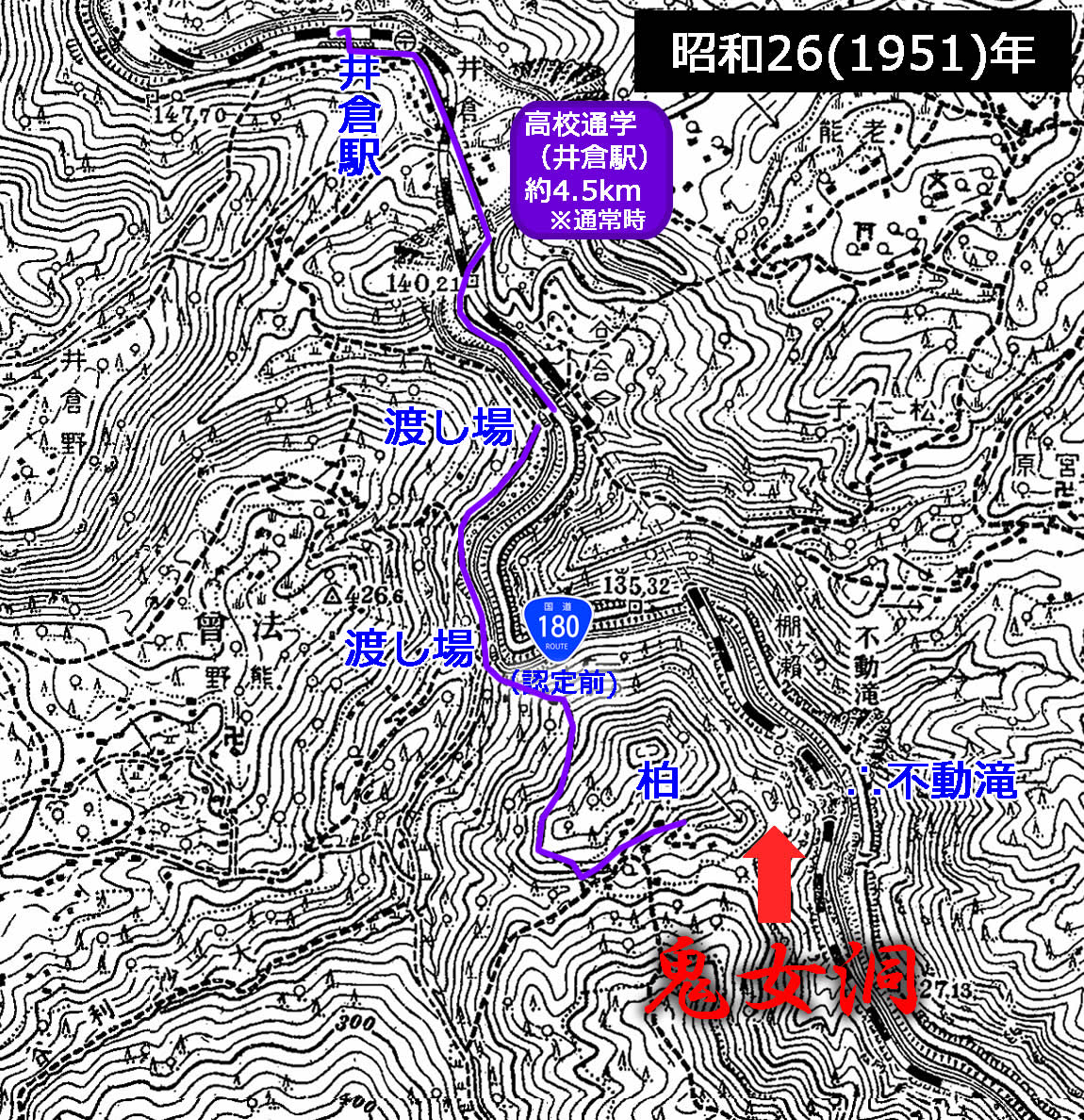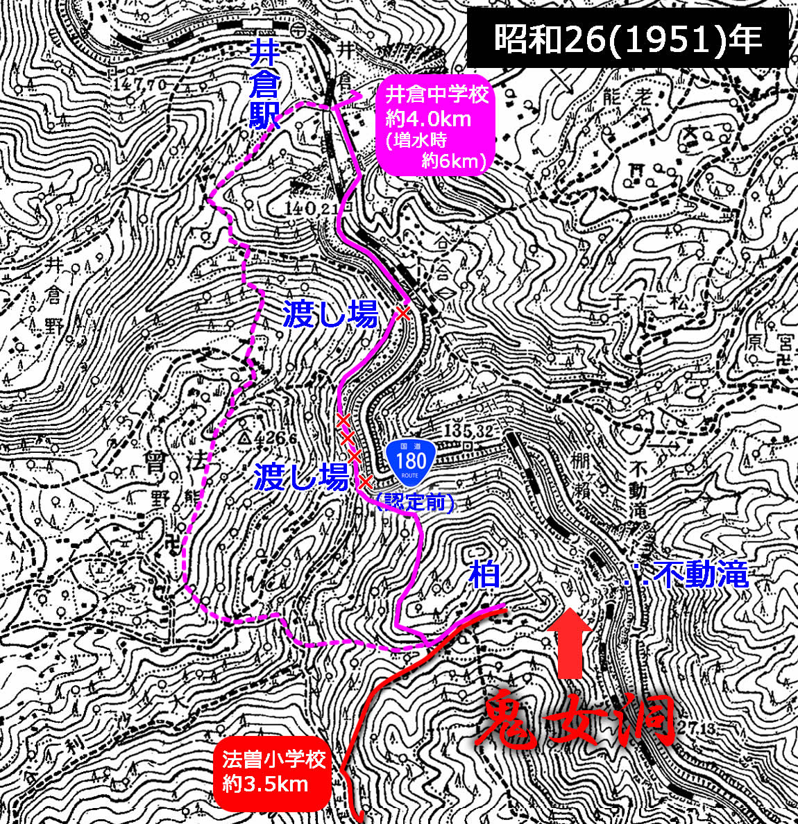 また、井倉中学校(平成22(2010)年閉校)へは、片道4kmの道を歩き、やはり増水時には図中にピンクの線で描いたような、大変な迂回路を通らねばならなかった(約6km)というが、鬼女洞を通った記憶はないらしい。(理由は分からないが、学校で厳しく禁止されていたのだろうか?)