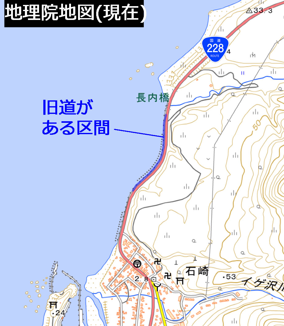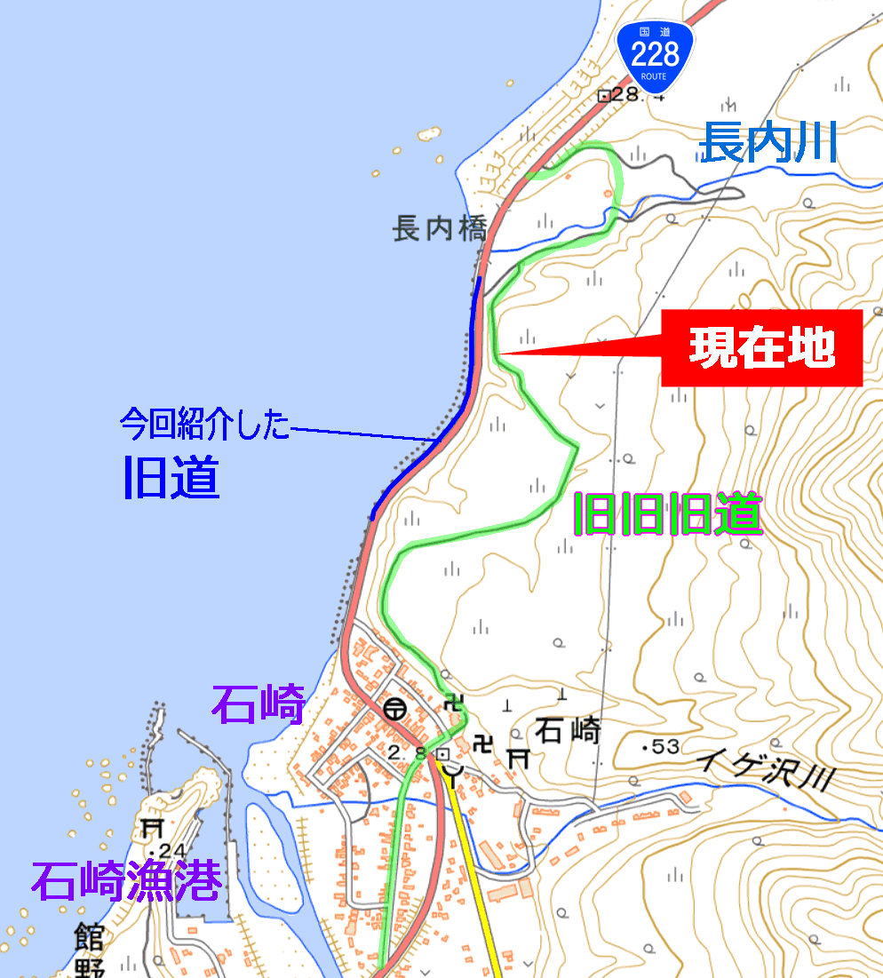 国道228号は海岸沿いの区間が多い道路だが、今回探索個所は、その中でも特に越波による問題が顕在化していた場所なのだろう。