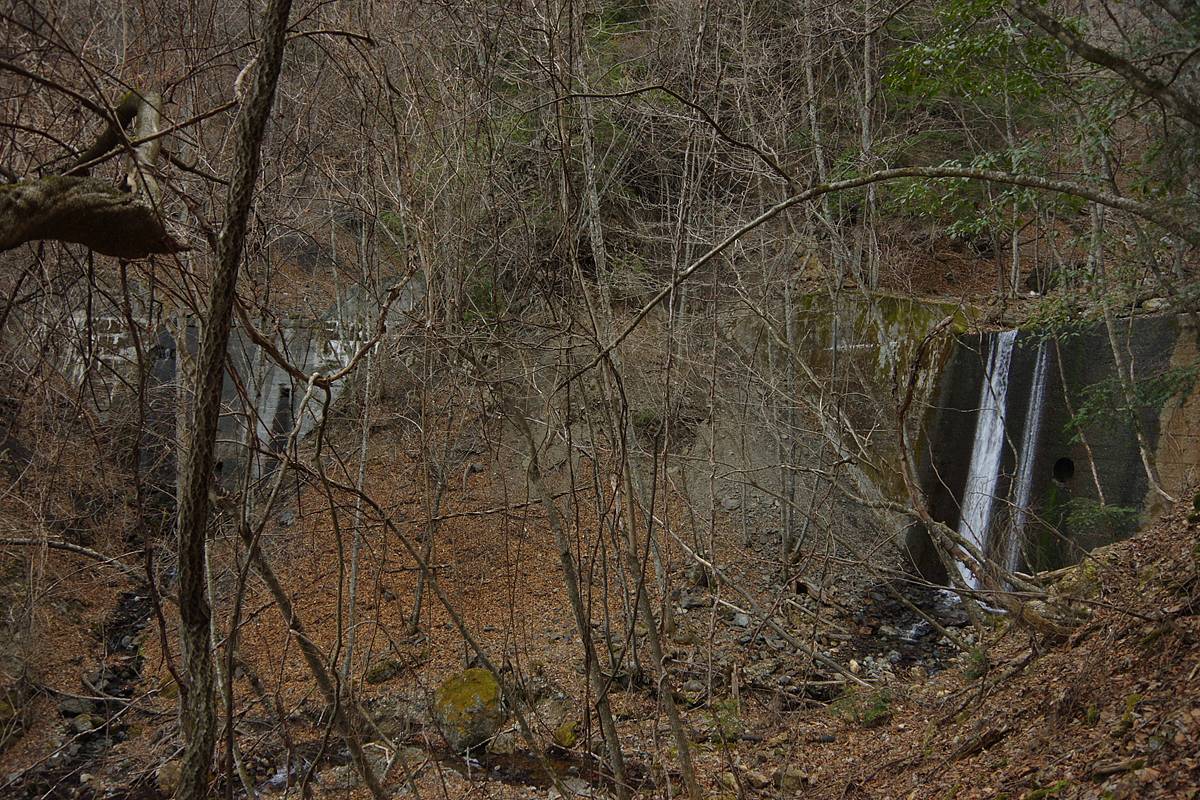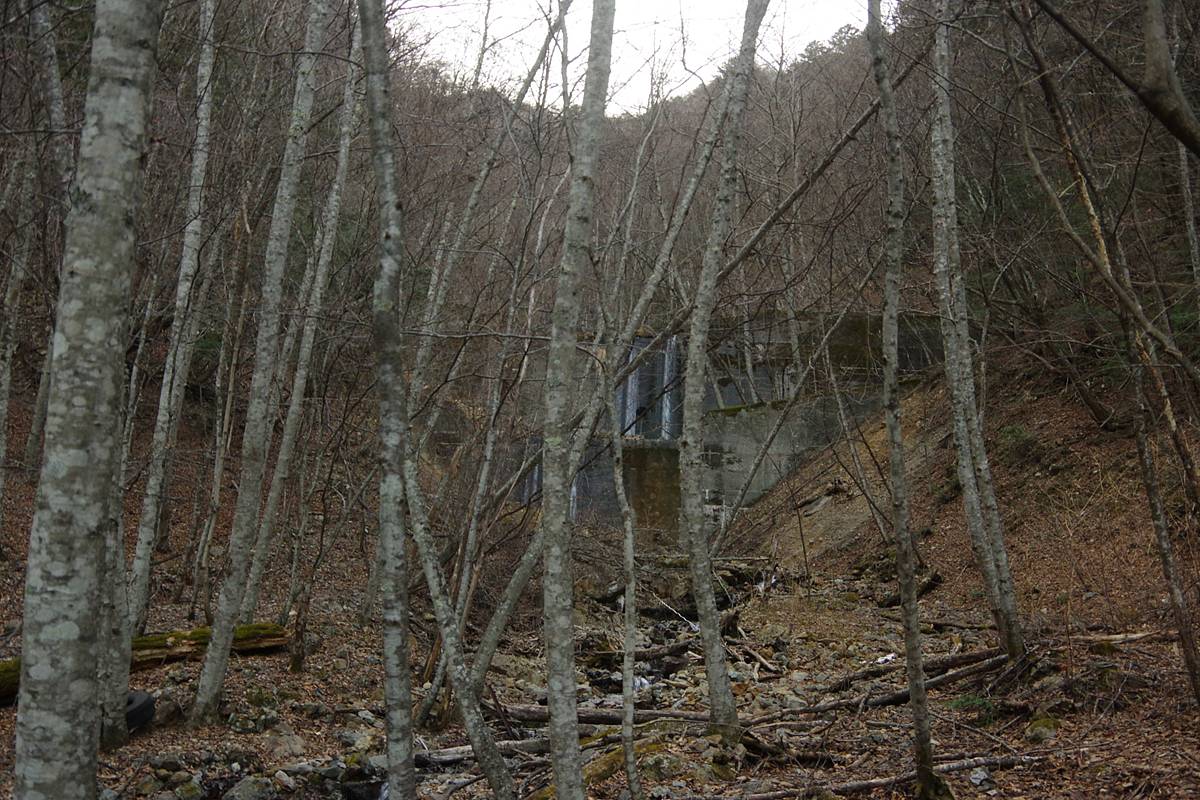 合流地点の下にも地形図にない砂防ダムがあり、林道を支えるべく、道なき険谷に多くの労力が投入されていたことを知る。