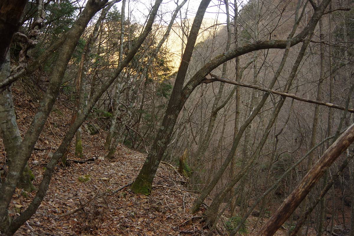 仄かに平場だったような気配がないとも言い切れない程度の痕跡があるような気がしないでもない斜面を、疑心暗鬼になりながら、さらに3分、距離にして50mくらい、滑る斜面に辟易しながらトラバースし続けてきたところだ。
