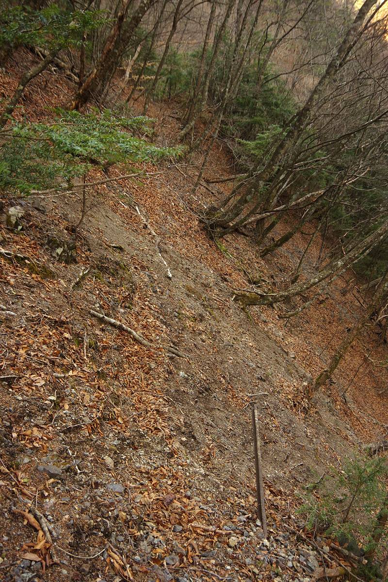 砂防ダムから少し離れると、平場は斜面と区別が付かなくなってしまった。