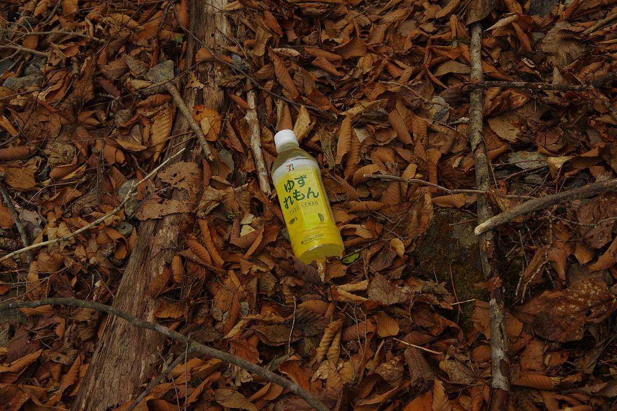 今のところ軌道跡は見当らないが、斜面にはときおり、林道から落ちてきたらしき人工物の残骸が散らばっていた。