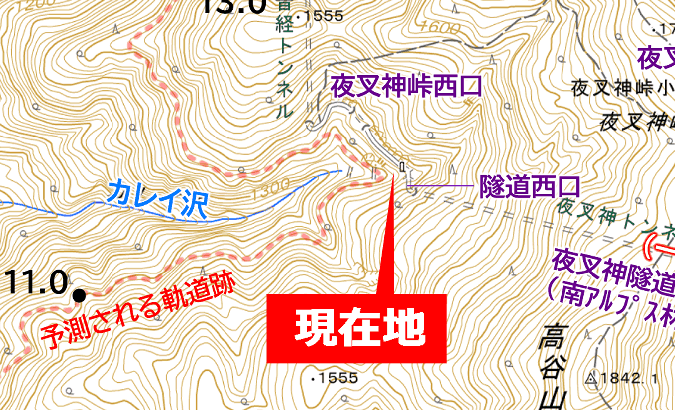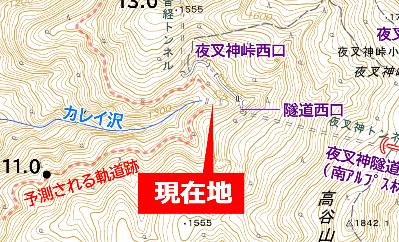 既知と既知を繋ぐ未知の軌道跡は、上の画像に赤い点線で描いたようなルートで敷設されていなければならないはずで、途中でカレイ沢を必ず渡るはずだし、そのポイントは夜叉神隧道西口からそれほどは下らないのではないかと考えられた。その高低差は最大でも100mはないはずだった。