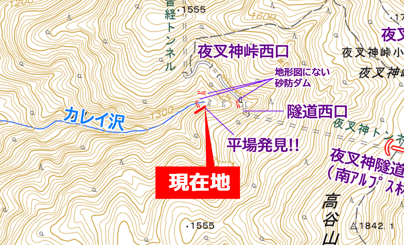 1日目の探索が最も順調に行った場合は夜叉神トンネルまで進行し、そこでそのまま夜営して2日目の歩行へ繋げる計画だった。