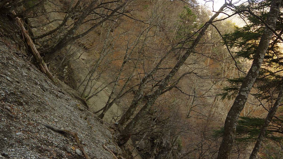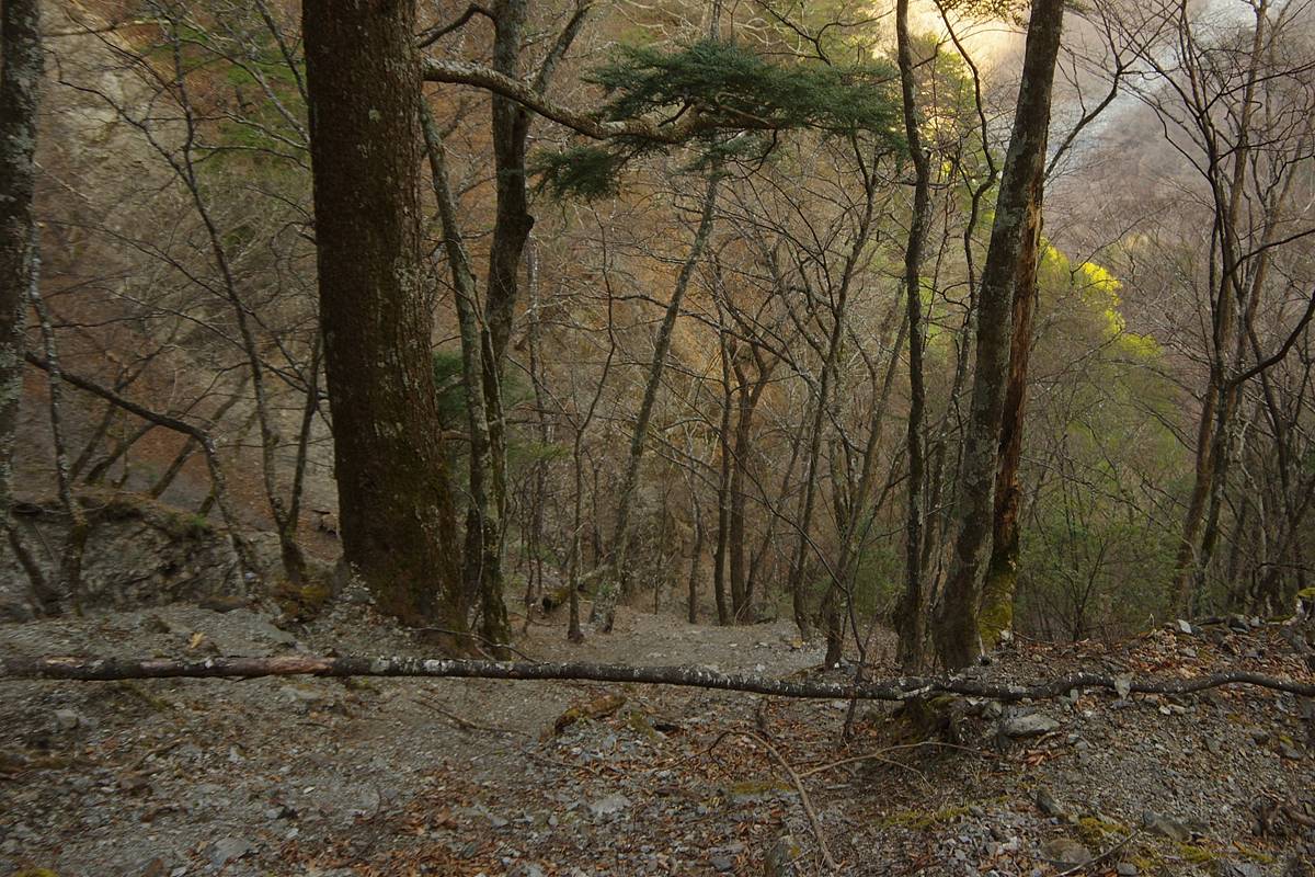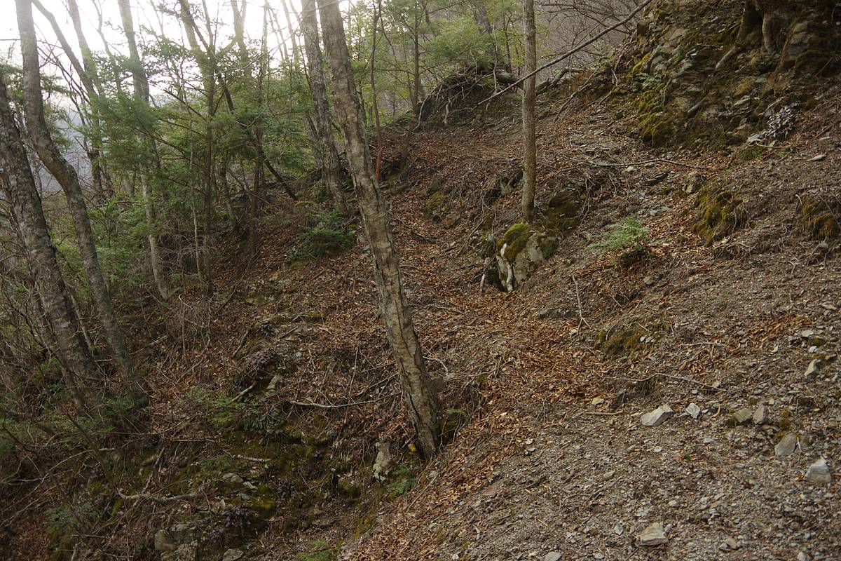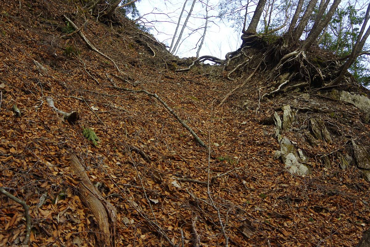 落葉の下は、大抵どこもかしこも硬く締まった礫斜面で、これが滑りまくる。