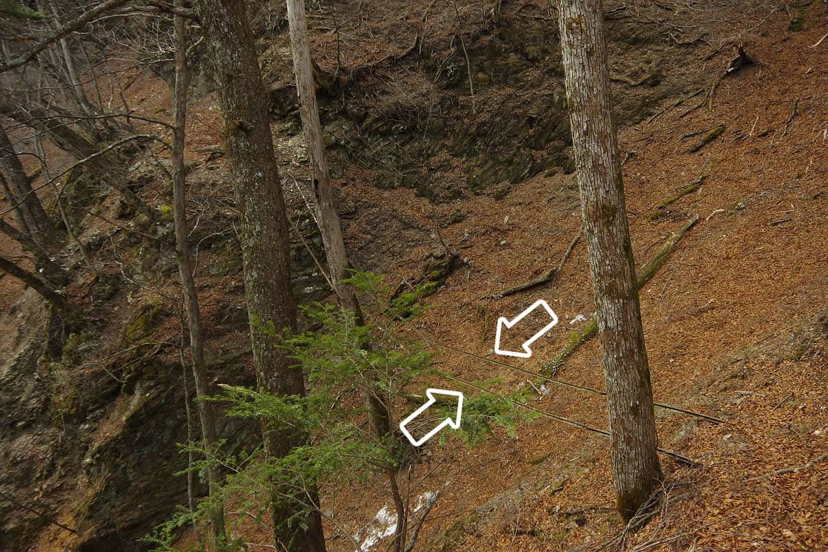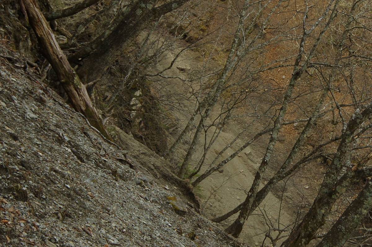 シカのように無鉄砲でも軽やかでもない私は慎重な足運びに時間を費やしたが、ともかく欠壊地の底まで下りることに成功し、その下ってきたところを振り返って撮影した。