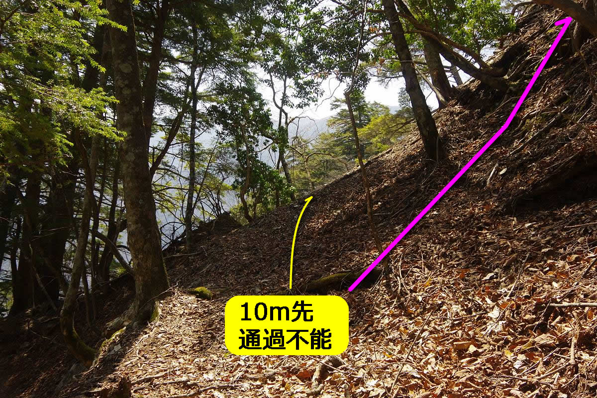 この場面、今しがた強引に乗り越えた尾根を、軌道は先端近くまで行って回り込んでいると予想しており、こちらから辿ろうと思ったが、早くも歩行不可能となった。