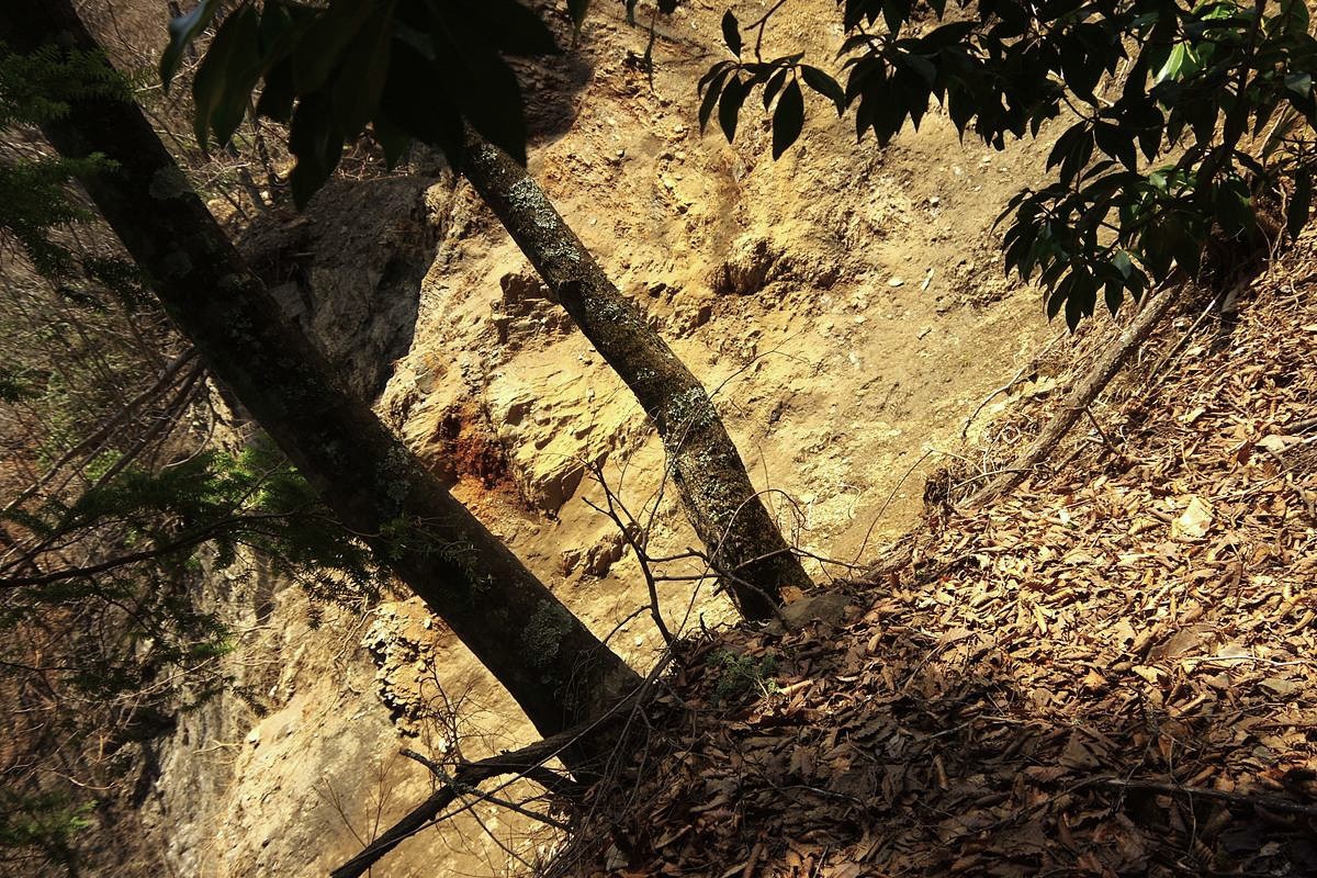 妙に黄色みの強い崩壊地は、砂粒レベルにまで激しく破砕化した岩盤らしく、その下部は底知れぬシュートへと連なっていた。