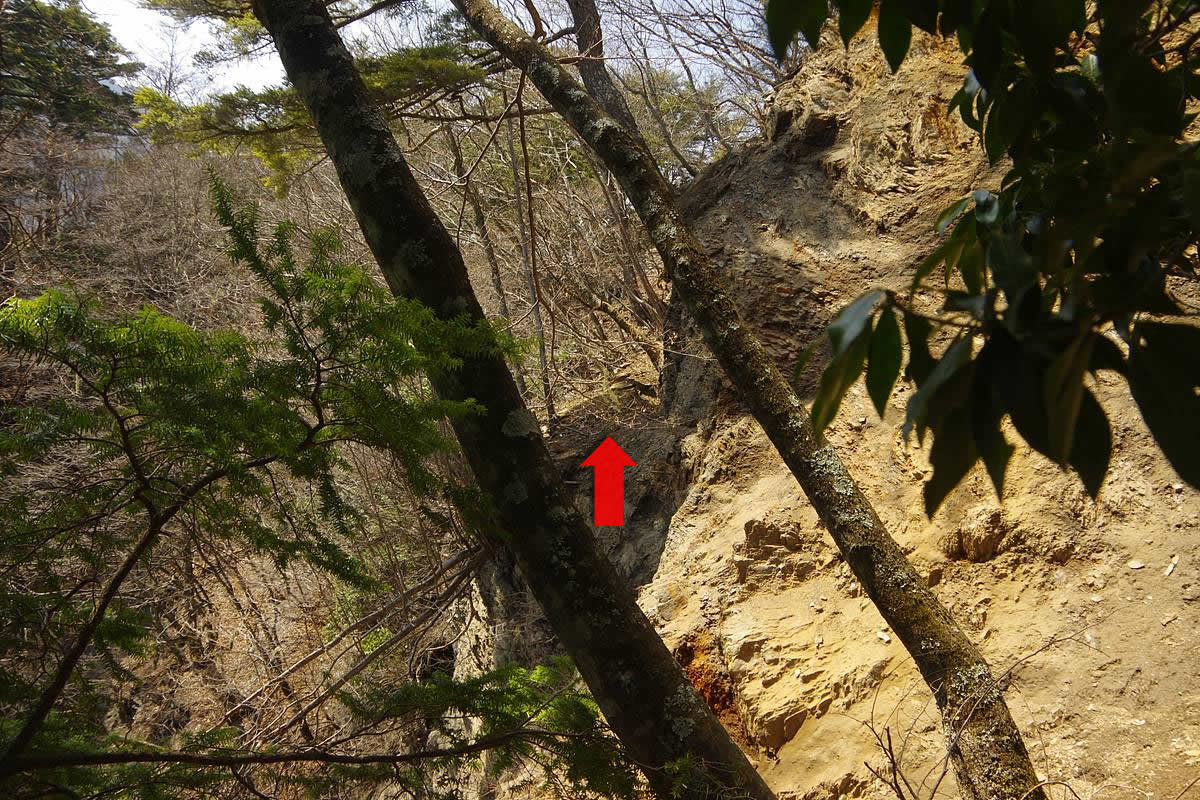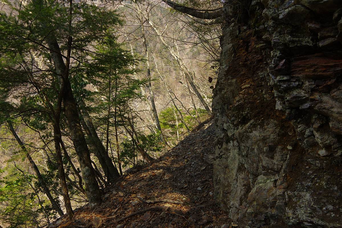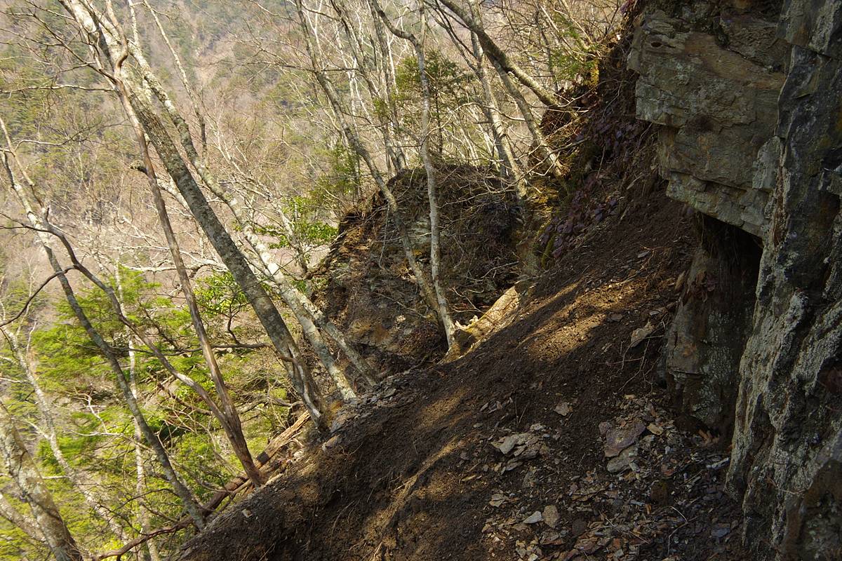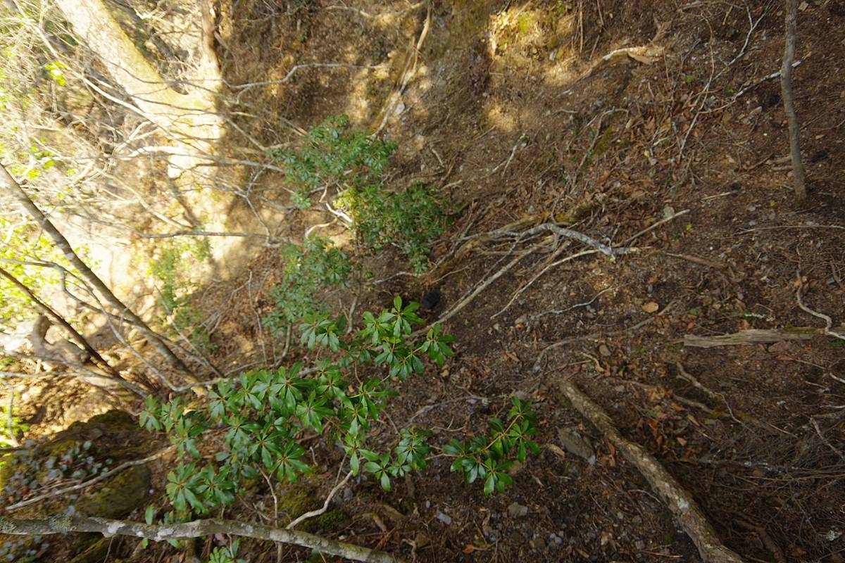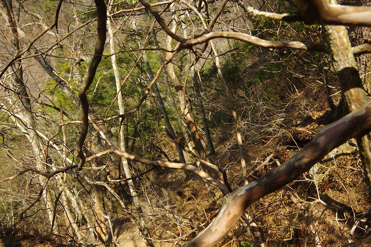 尾根の上は狭く、自由に歩き回ることは難しかったが、全く動けないわけではなく、角度を変えて何度かアザミ沢側を覗き込んでいるうちに、先ほど登った分と等しい約10mの落差の下に、確かに細々とした平場があるのが分かった。