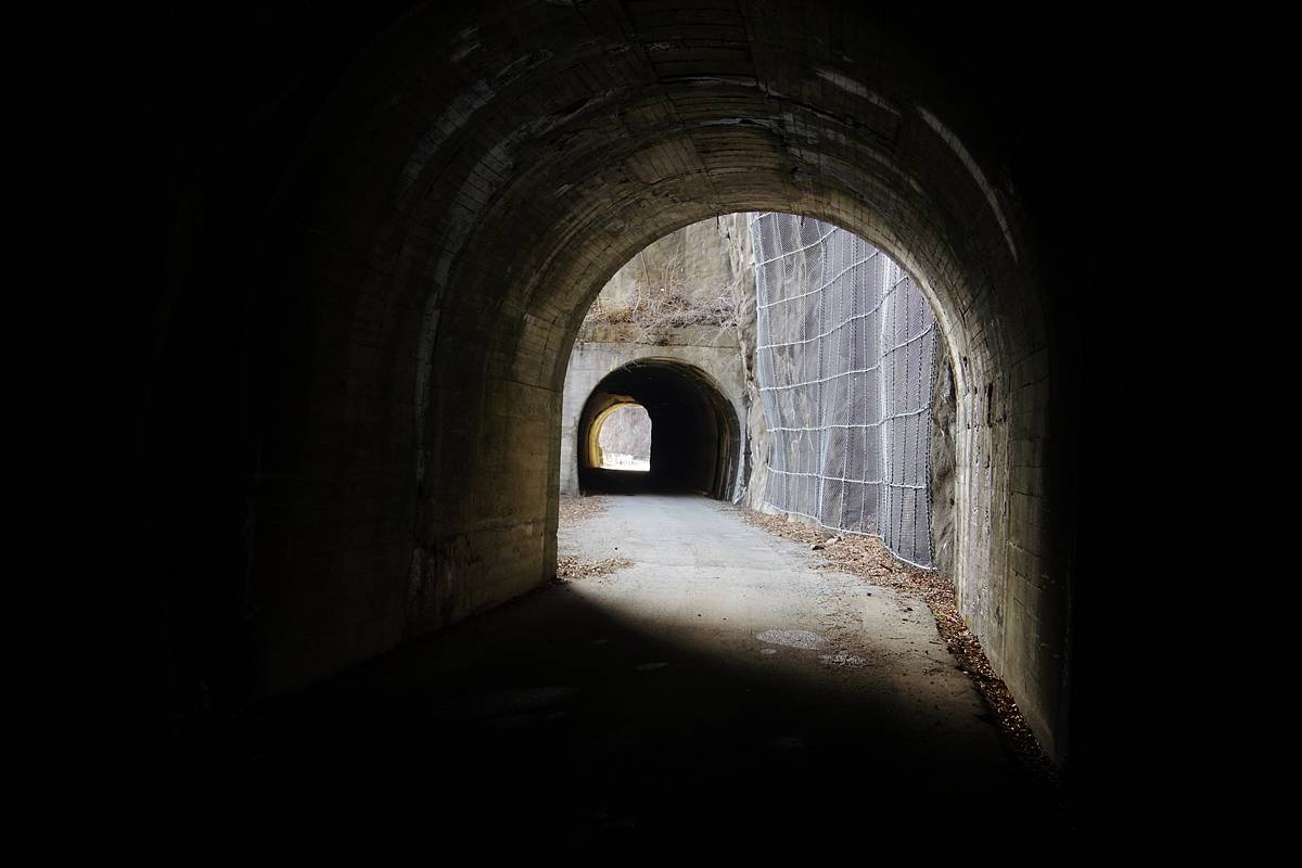 冷たく乾いた空気が吹き抜ける暗い洞内に入ると、出口の向こうに次の第9号隧道が見えていた。