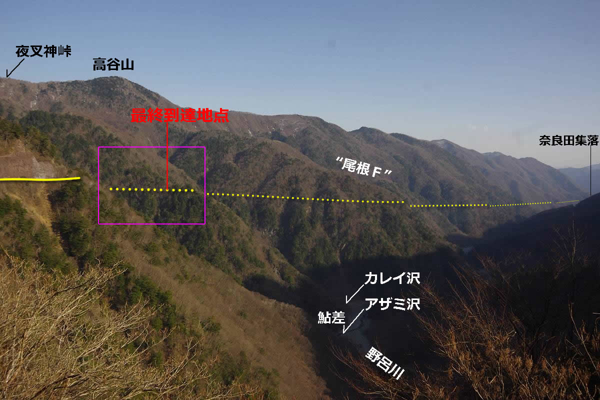全長54kmと言われることもある極めて長大な(実際に同時に存在していたのは最大39km)早川林鉄の終点として『トワイラ〜』や『早川町誌』に地名が出ている“深沢尾根”は、この深沢を渡った向こう側の尾根である。