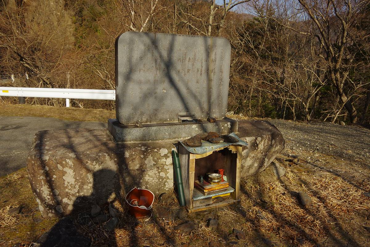 橋を渡った右岸の袂で右へ砂防ダムの工事用道路が分かれているが、その岐れの中又に苔生した小さな石祠が祀られていた。