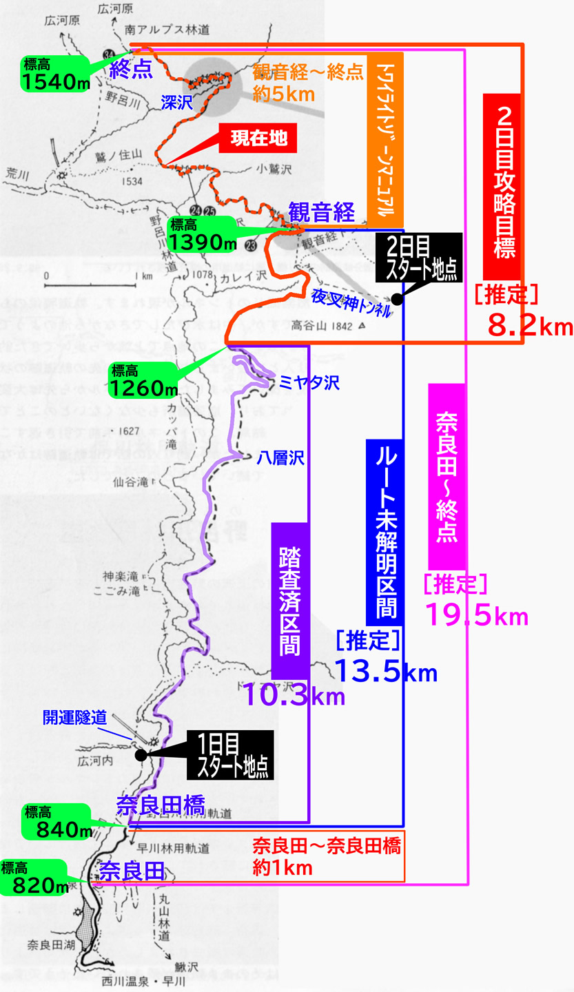 それでもこの日のザックは軽量化が出来ていた。この7年前に山中多泊の大荷物で挑んだ“千頭奥地”の経験を経ての軽量化であり、そうでなければ今回の2日間の強行軍は実現出来なかったと思う。たった2日だが、明るい時間も暗い時間も、歩いていない時間がほとんどない感覚だ。